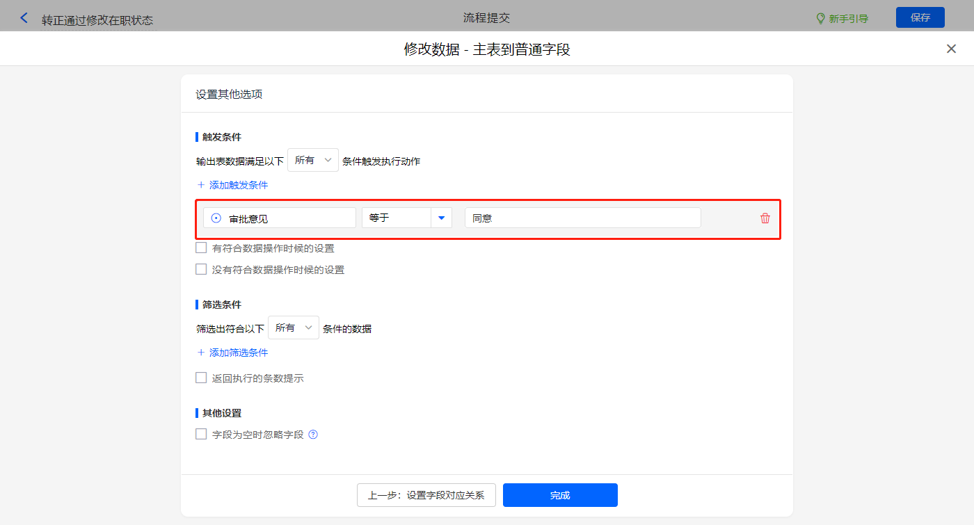 其他设置触发条件为【审批意见】等于同意,设置好点击【完成】并保存该数据助手;