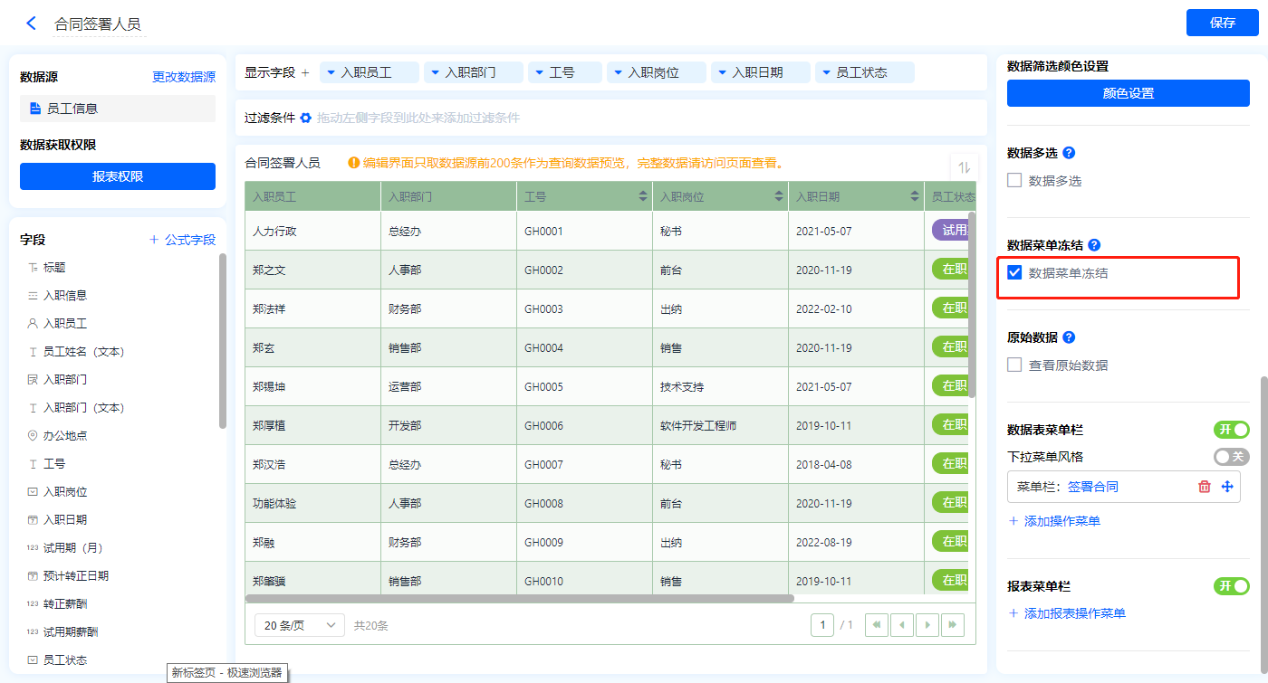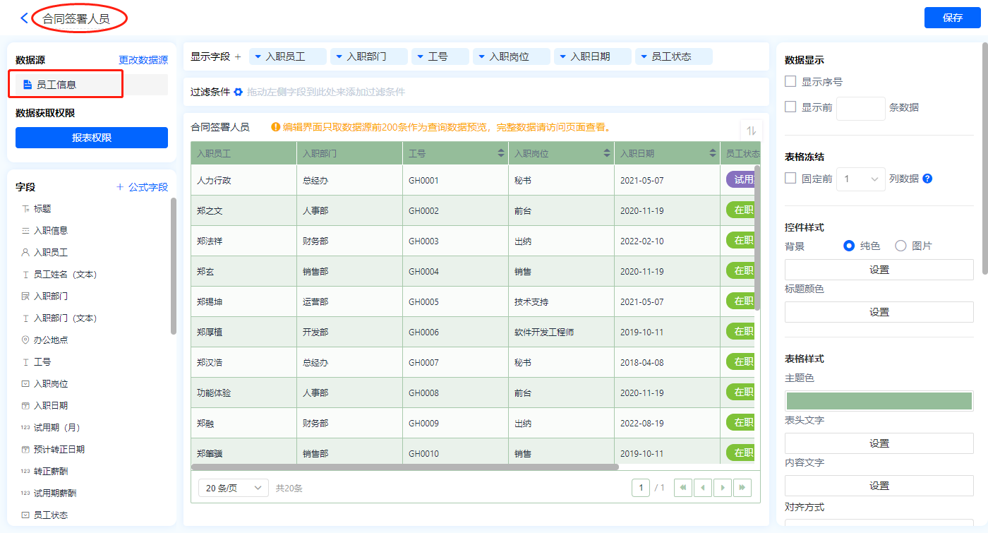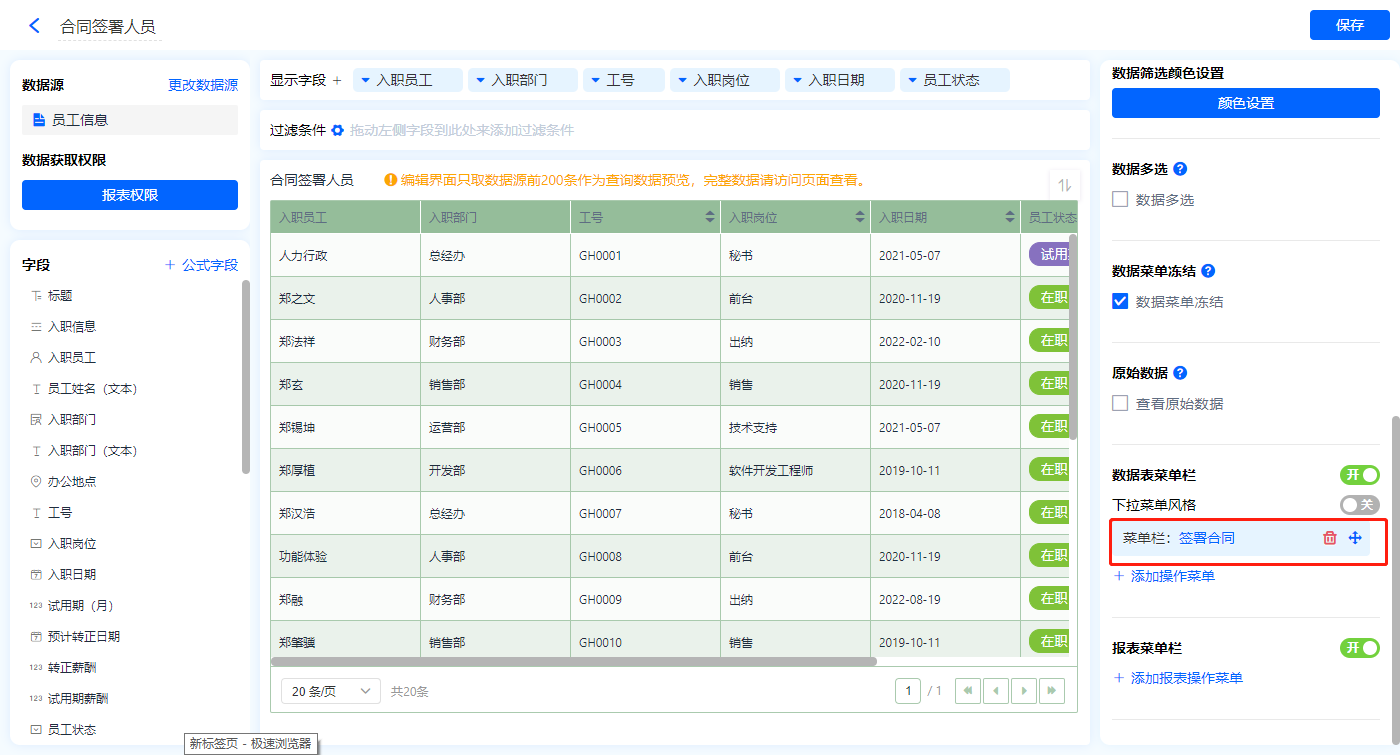 1)新增【劳务合同管理】报表,用基础报表【数据表】展示数据源为表单【员工信息】的数据;
