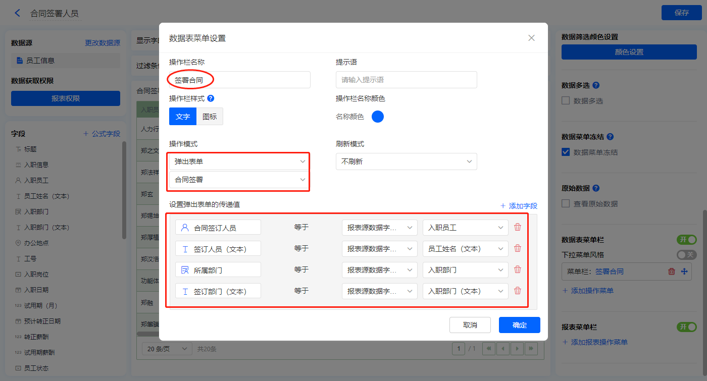 【签署合同】的菜单栏,操作模式设置为弹出表单【合同签署】;