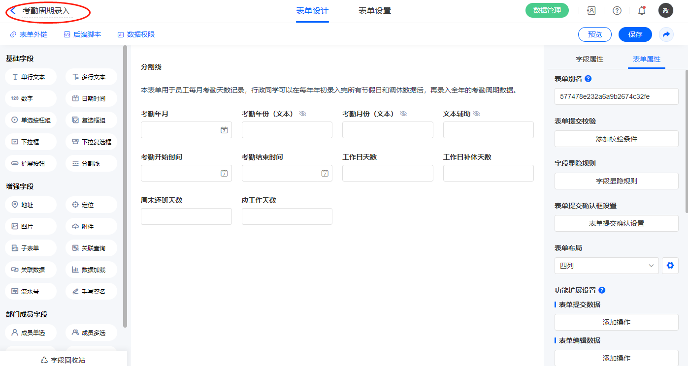 2.7、表单【考勤周期录入】字段及表单属性设置