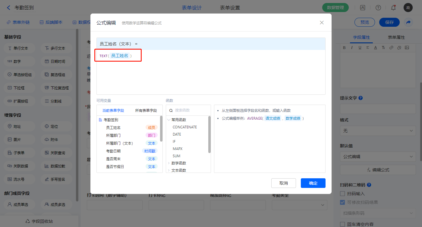 【打卡时间(数字辅助)】字段,默认值选择公式编辑,如图设置公式;
