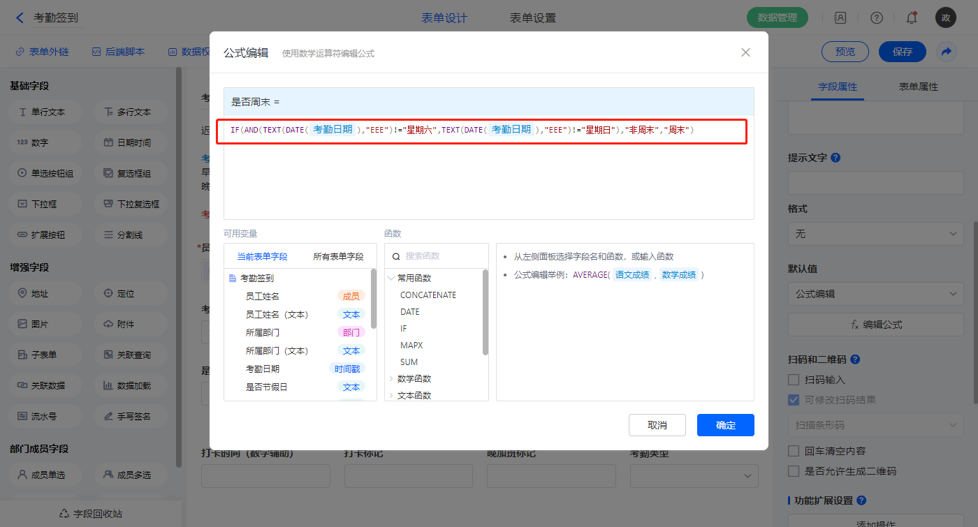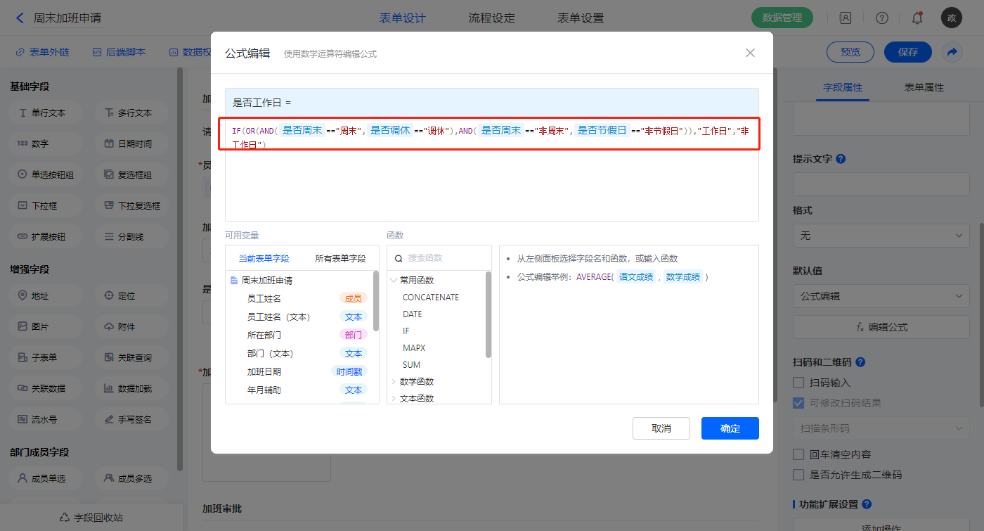 【是否工作日】字段,默认值选择公式编辑,如图设置公式;