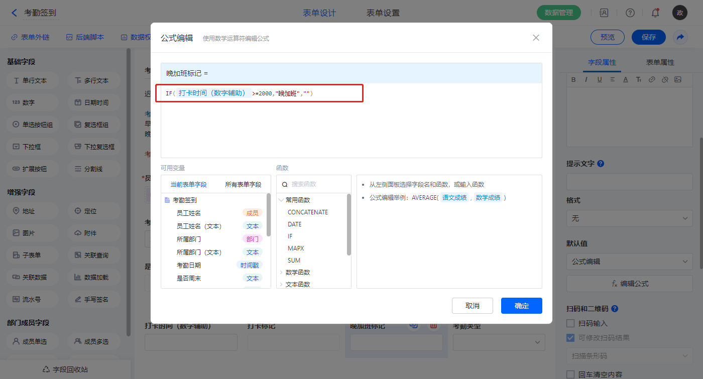 【晚加班标记】字段,默认值选择公式编辑,如图设置公式;