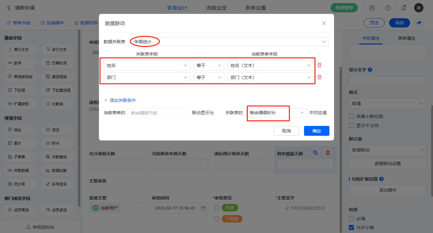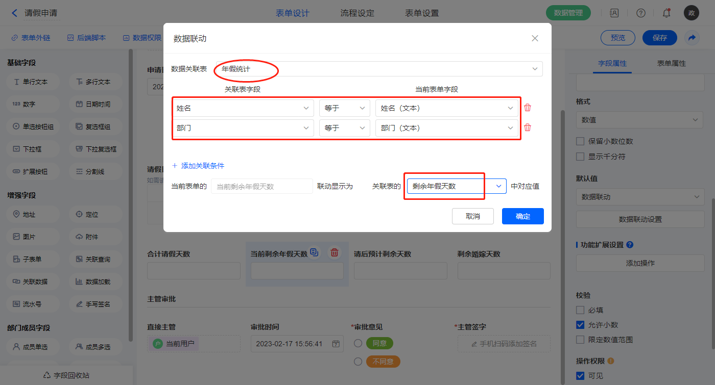 2)【当前剩余年假天数】字段,设置默认值为数据联动,设置联动条件及联动字段;