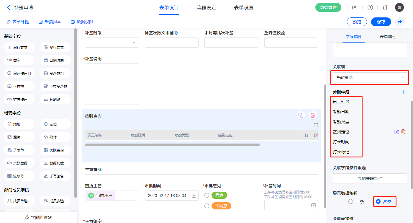 2)【签到查询】字段,设置关联表为【考勤签到】并如图选择关联字段,设置显示数据条数为多条;