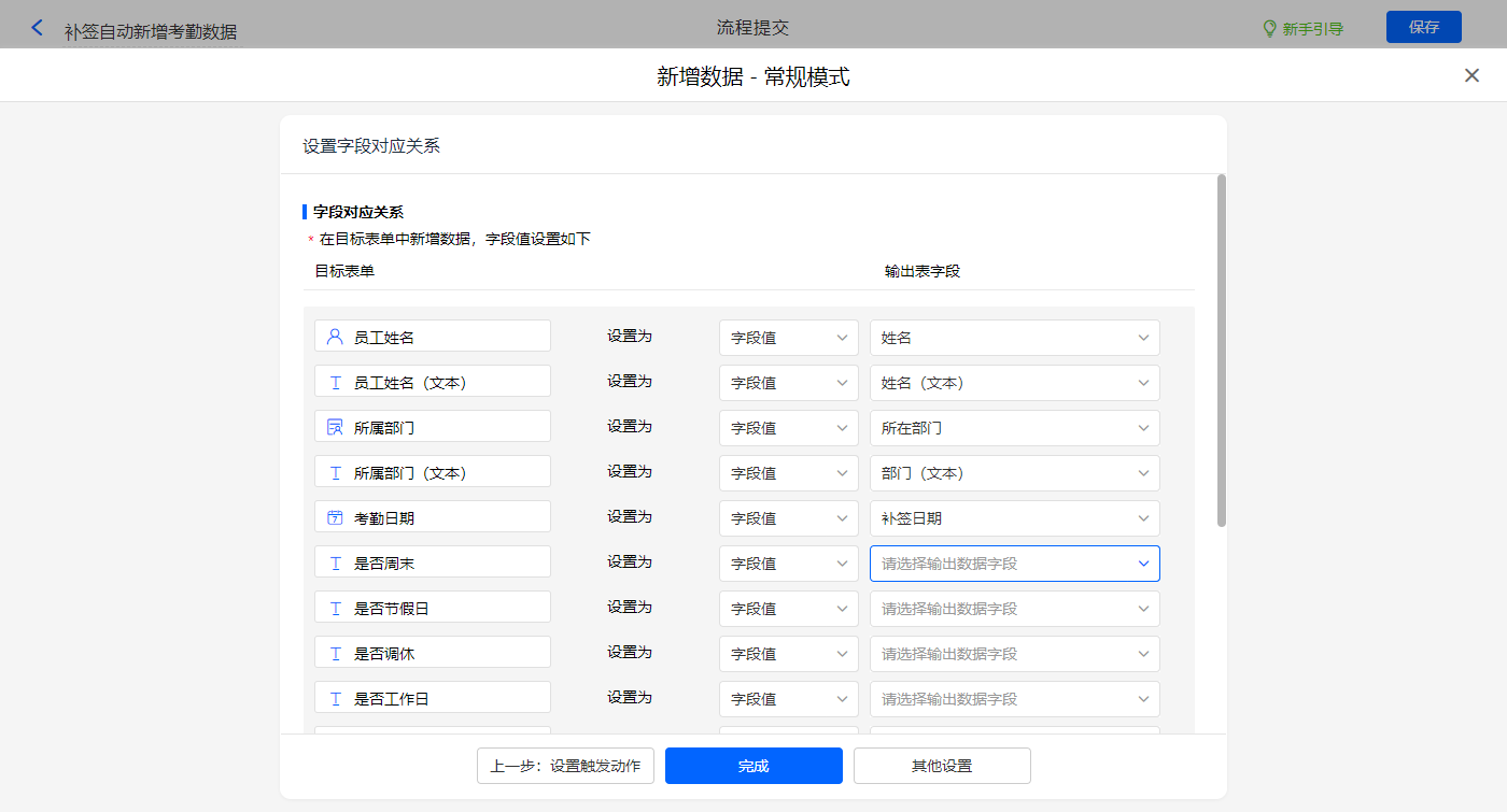 新增新增数据的执行动作,选择目标表单【考勤签到】,选择对应赋值字段;