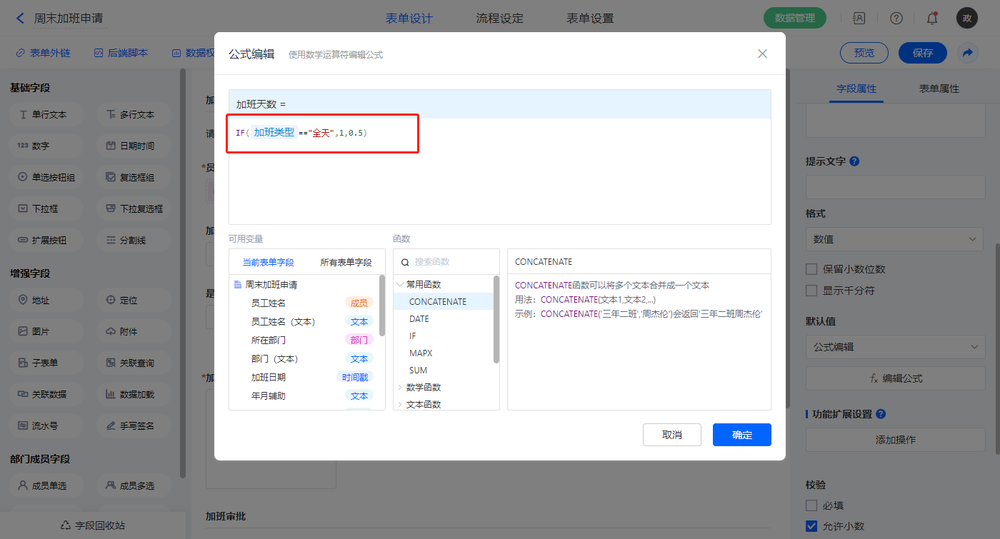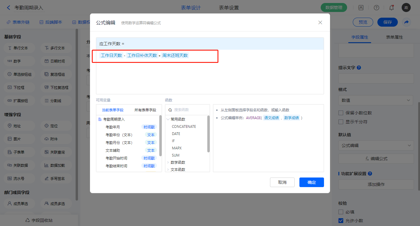 【加班天数】字段,默认值选择公式编辑,如图设置公式;