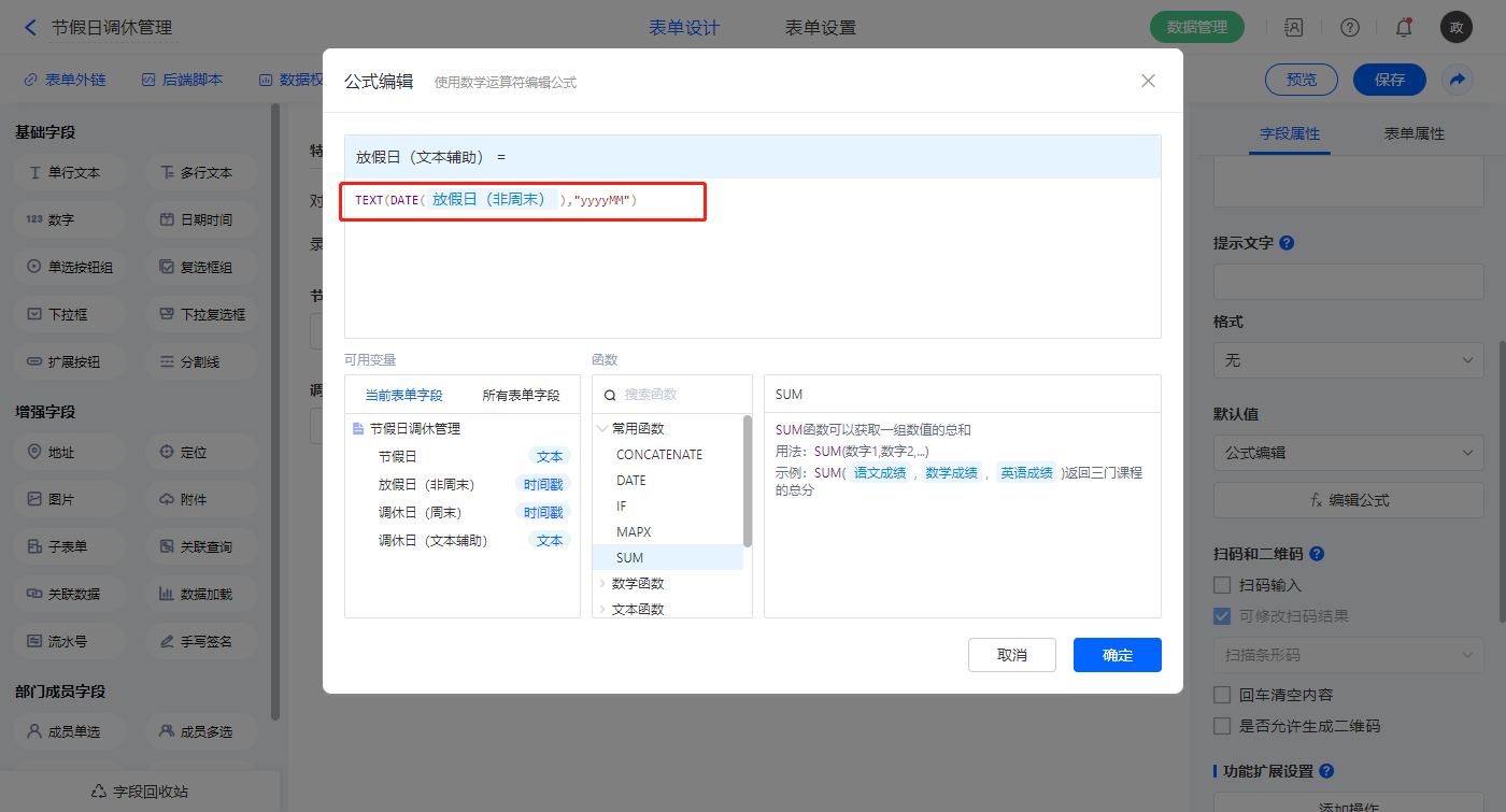 【调休日(文本辅助)】字段,默认值选择公式编辑,如图设置公式;