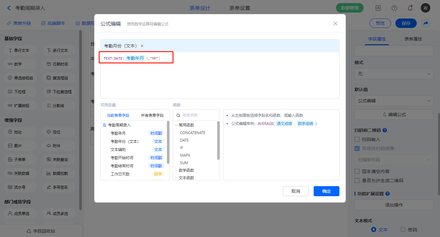 【考勤月份(文本)】字段,默认值选择公式编辑,如图设置公式;