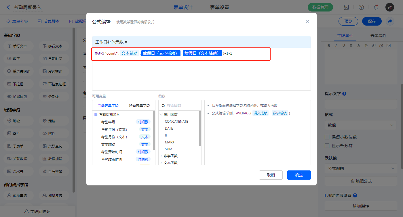 【补签次数文本辅助】字段,默认值选择公式编辑,如图设置公式;