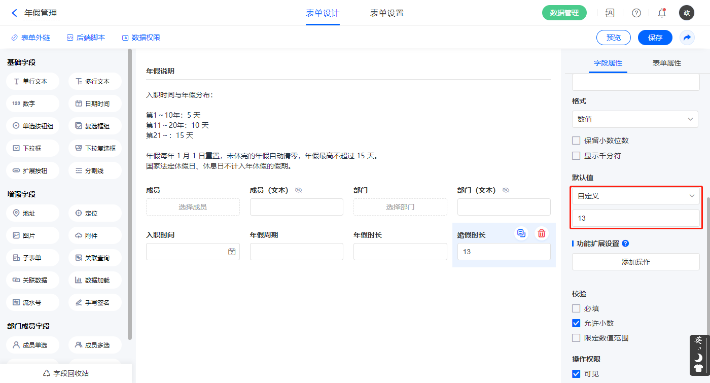 【婚假时长】字段,设置默认值“13”;