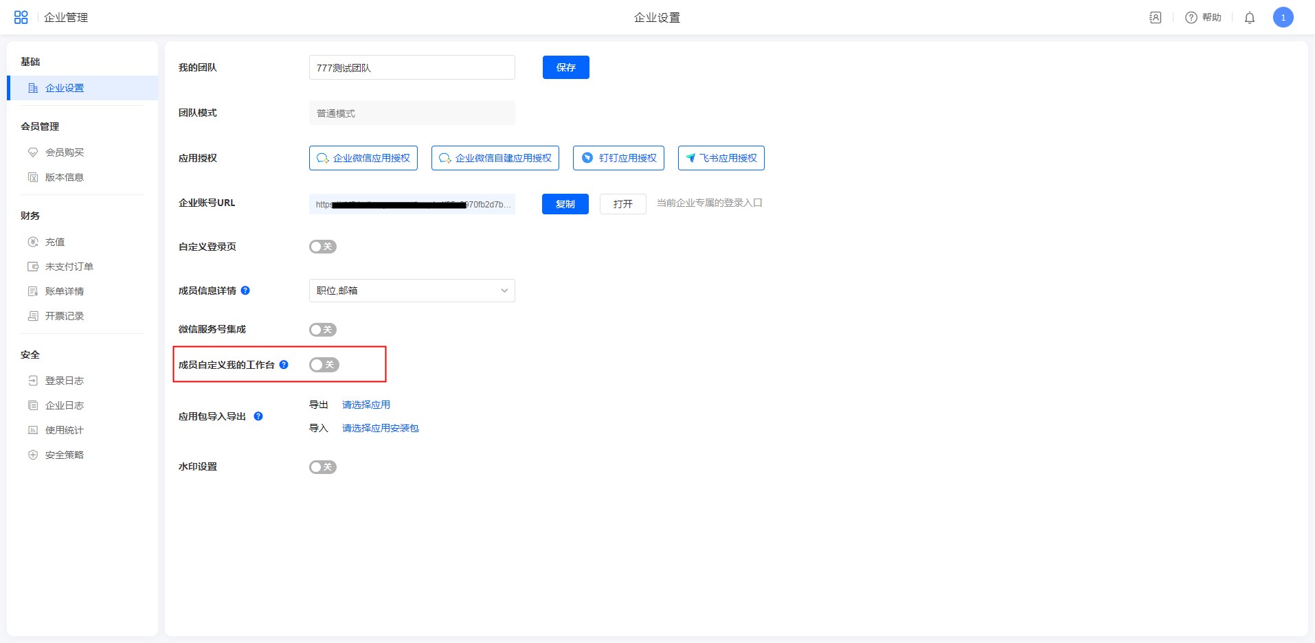 开启后,成员可以自定义我的工作台,功能详情见自定义工作台。