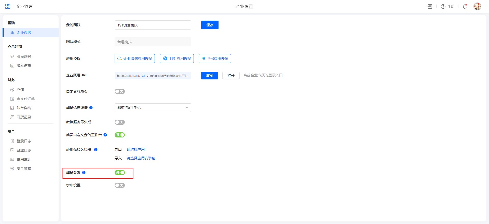展示团队的基本信息,可以绑定钉钉或企业微信。