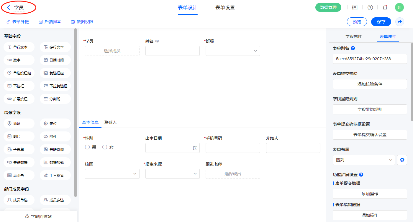 2.3、表单【学员】字段及表单属性设置