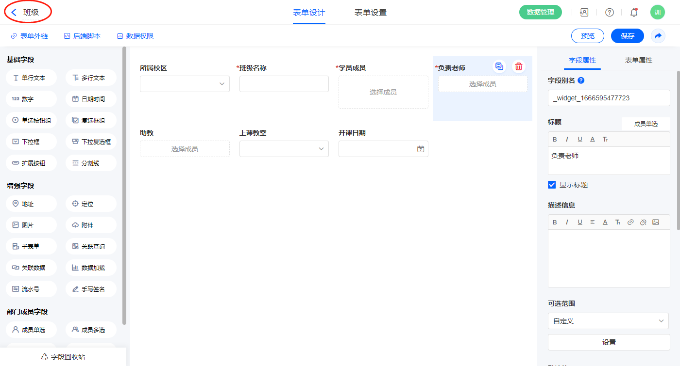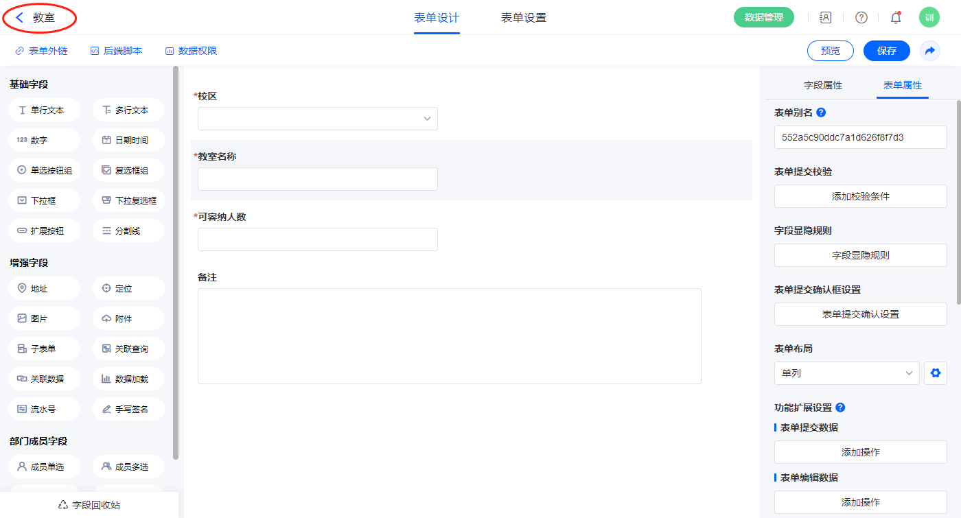 2)新增表单【教室】,字段设置如下;