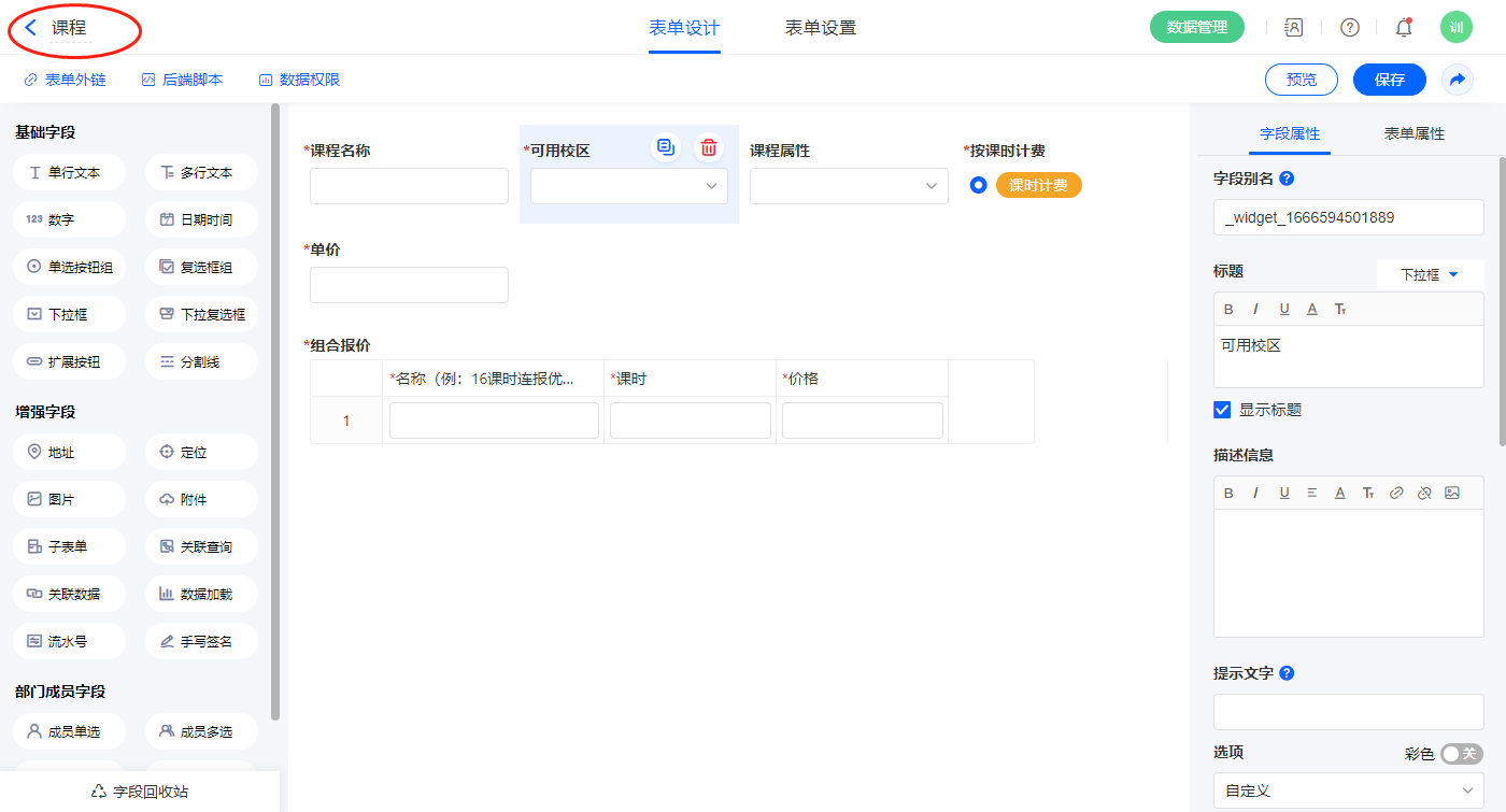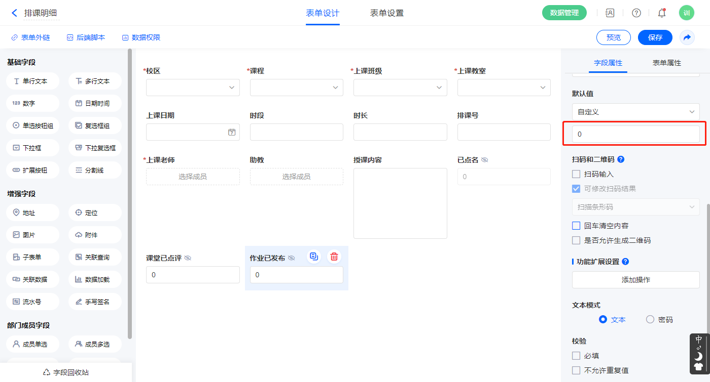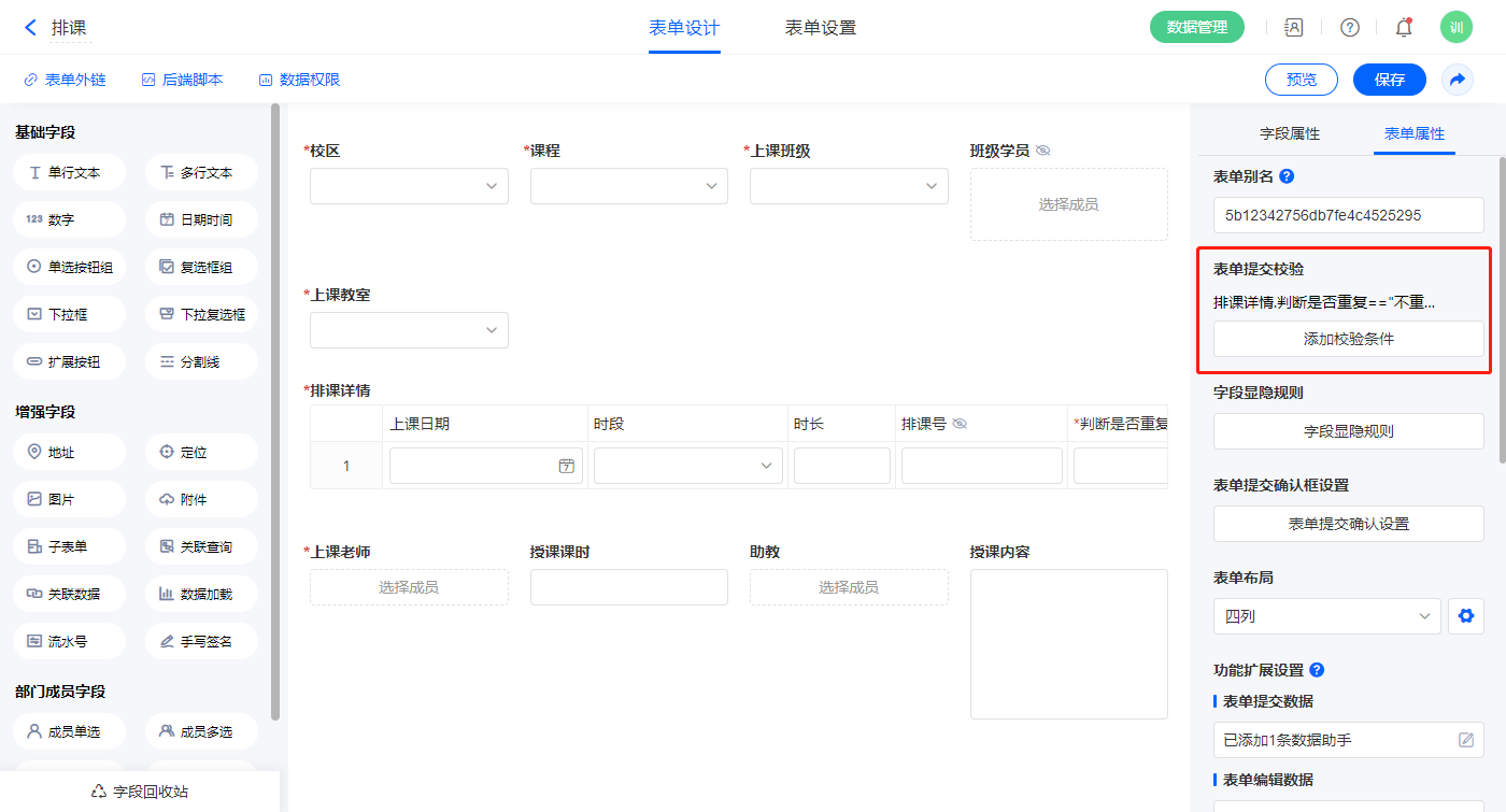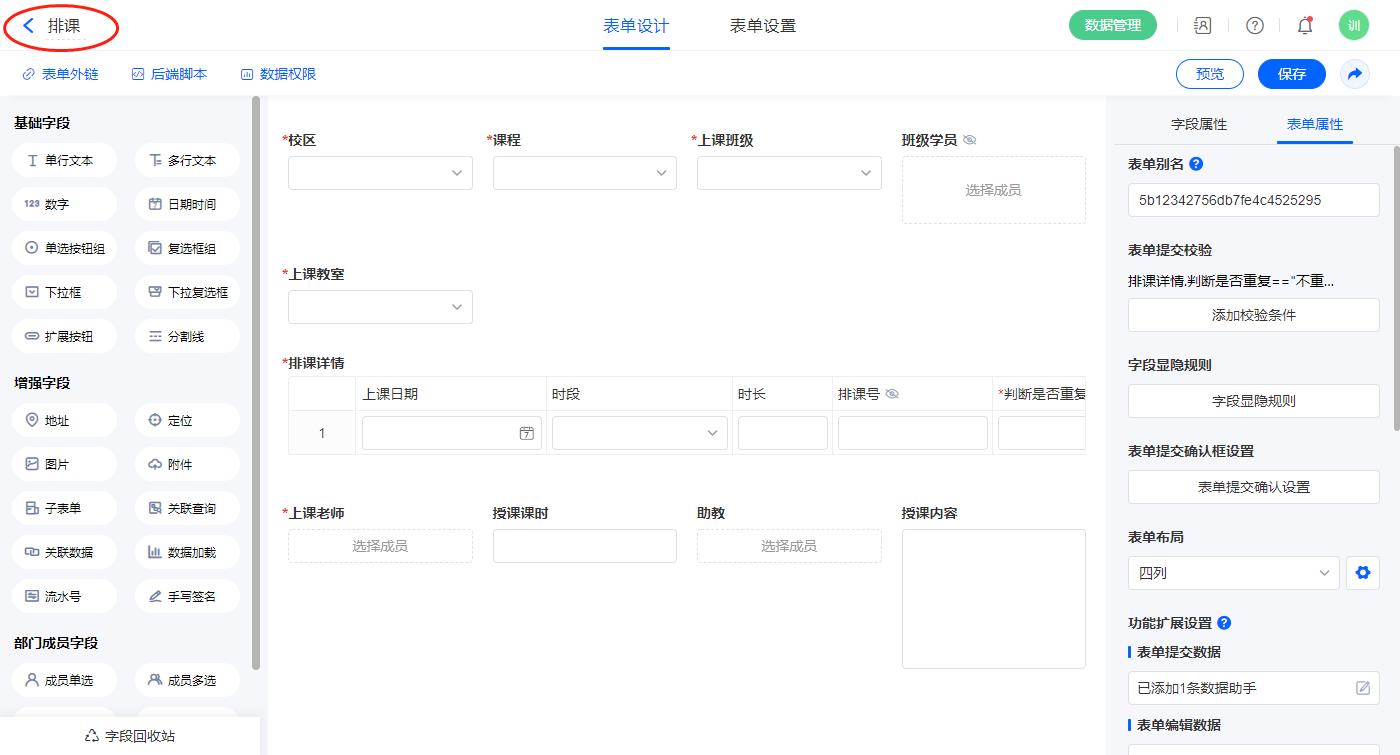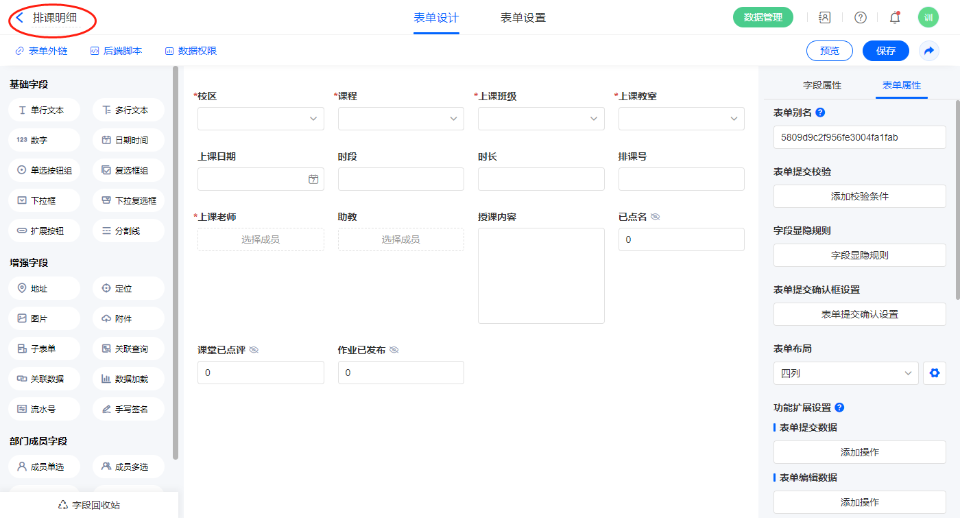 2.2、表单【排课】字段及表单属性设置