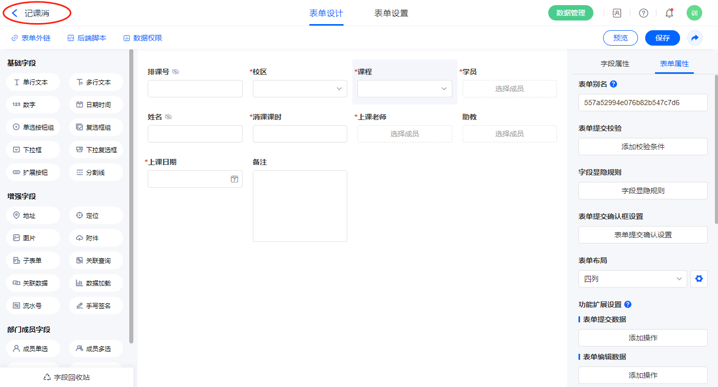 6)新增表单【记课消】,字段设置如下;