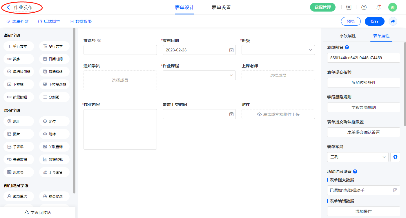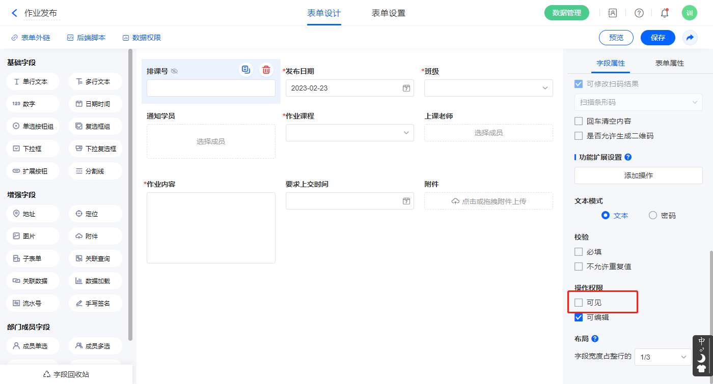 2.4、表单【作业发布】字段及表单属性设置