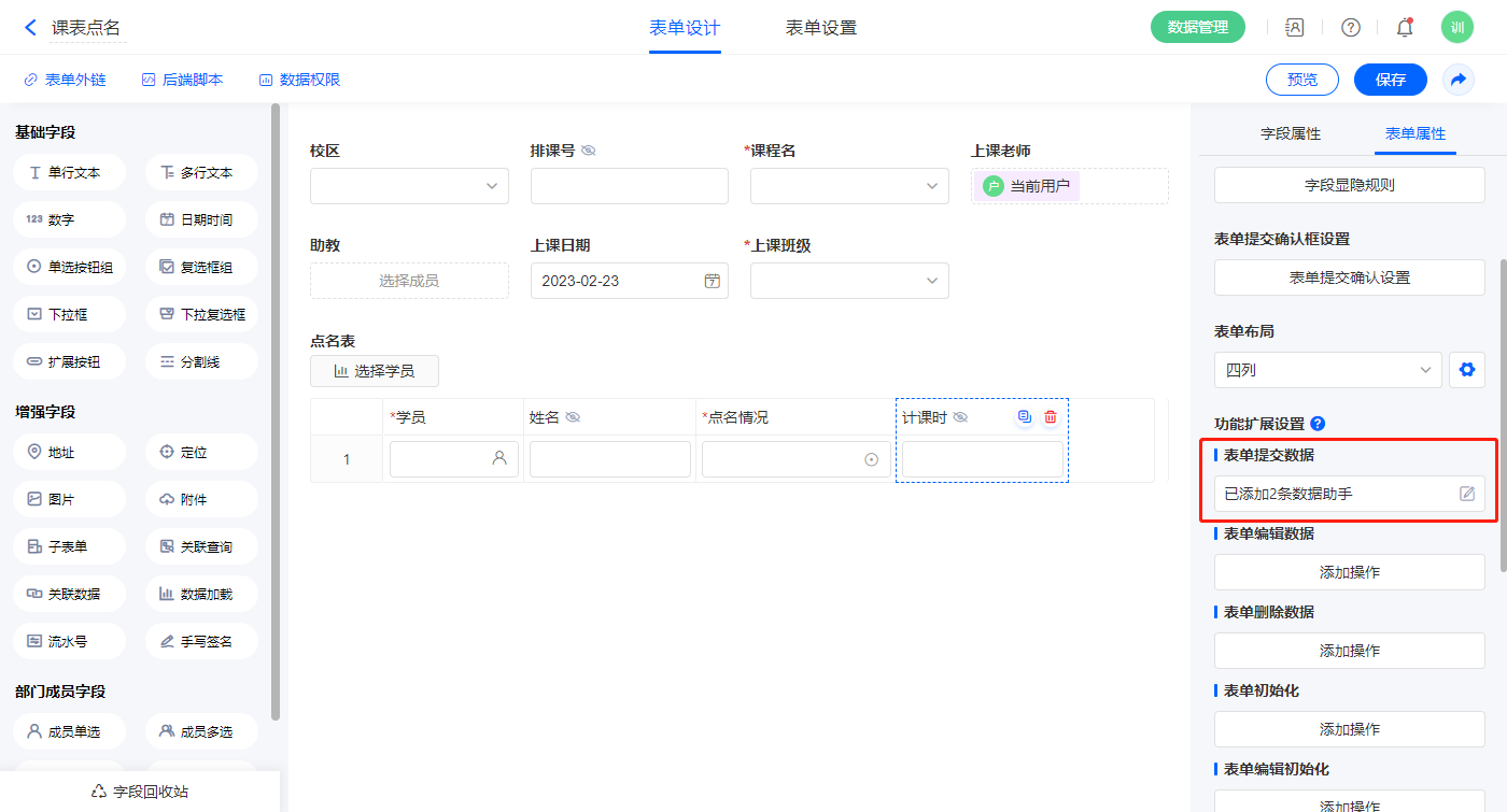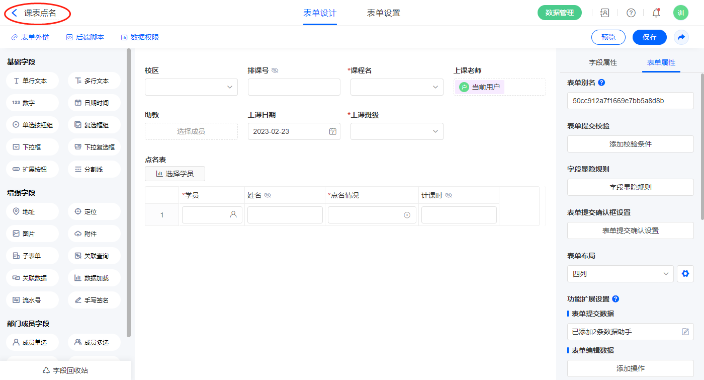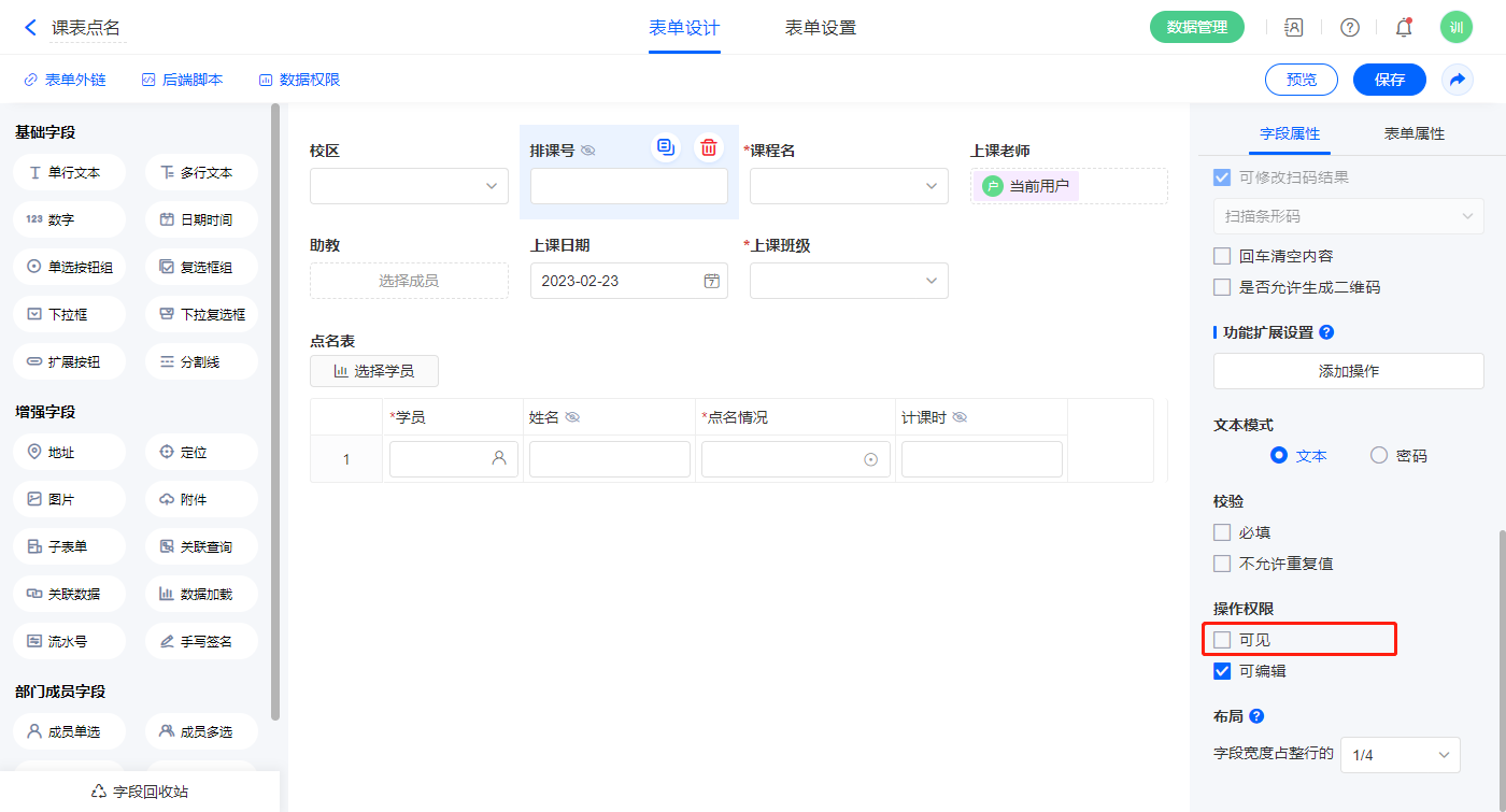 2.6、表单【课表点名】字段及表单属性设置