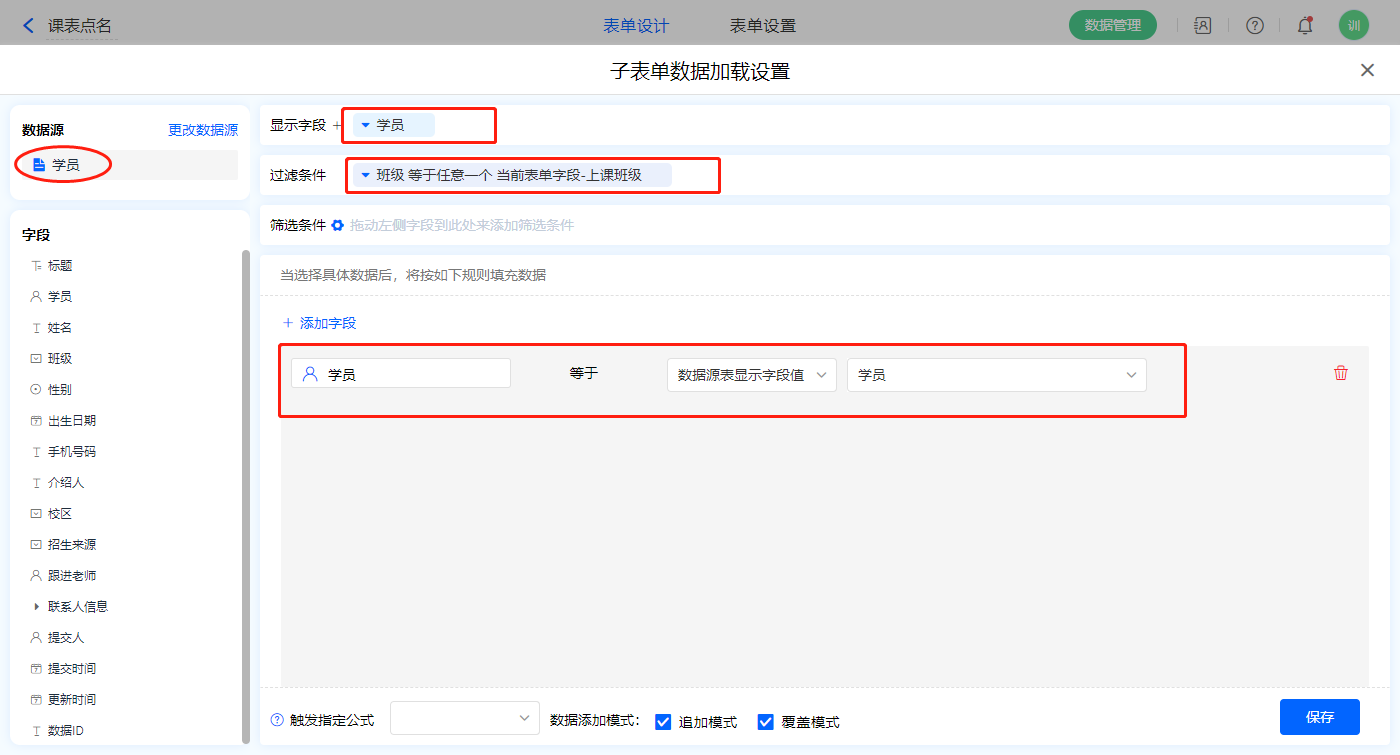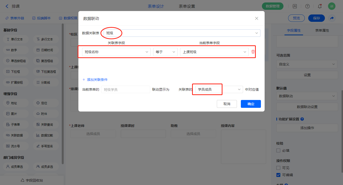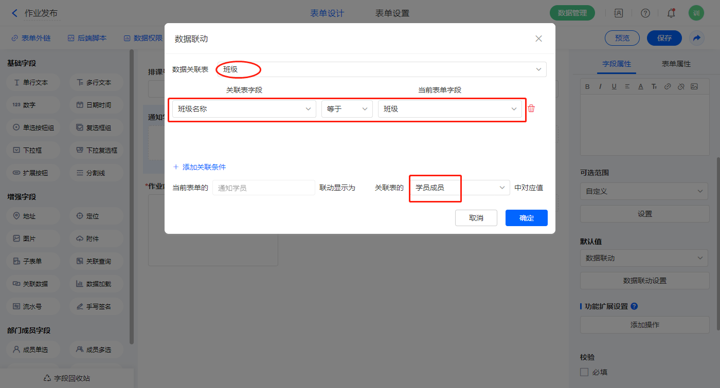 1)【班级学员】字段,设置默认值为数据联动,设置联动条件及联动字段,该字段为不可见字段;