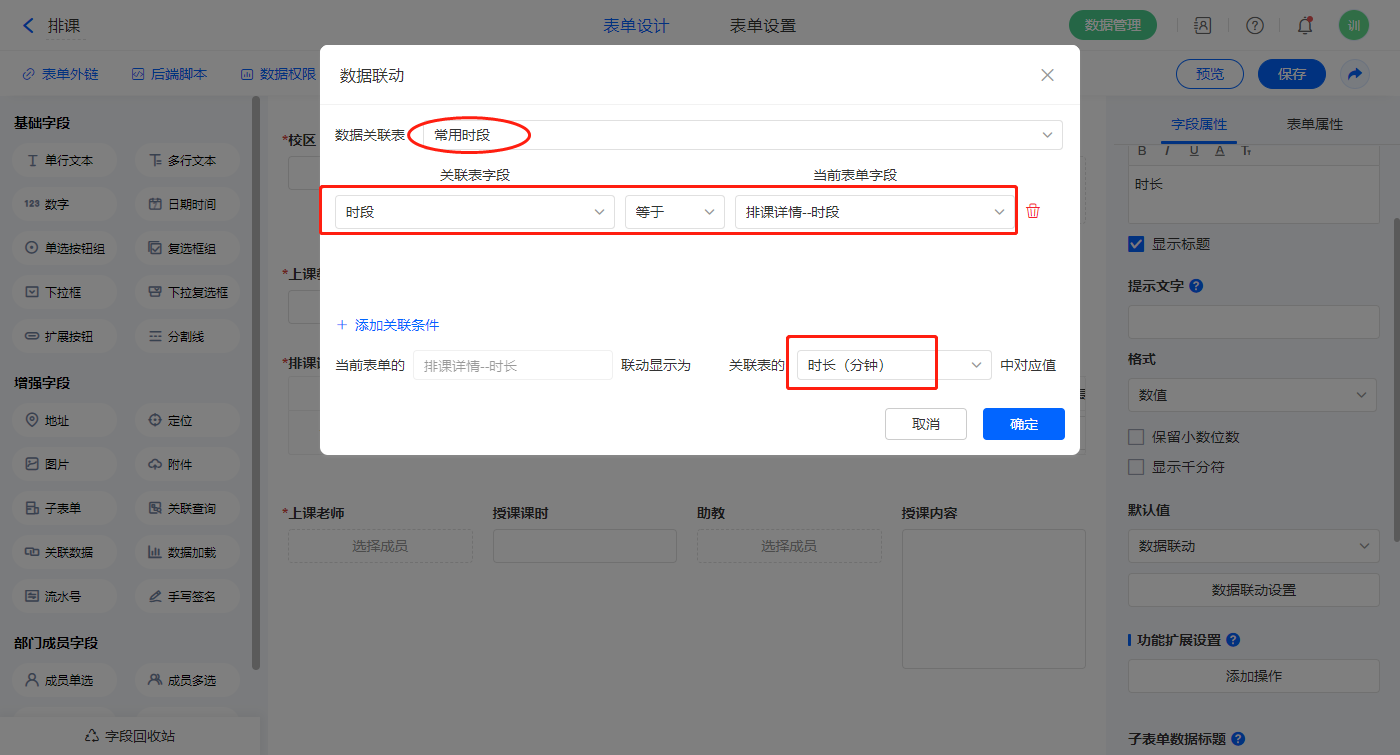 【排课详情.时长】字段,设置默认值为数据联动,设置联动条件及联动字段;