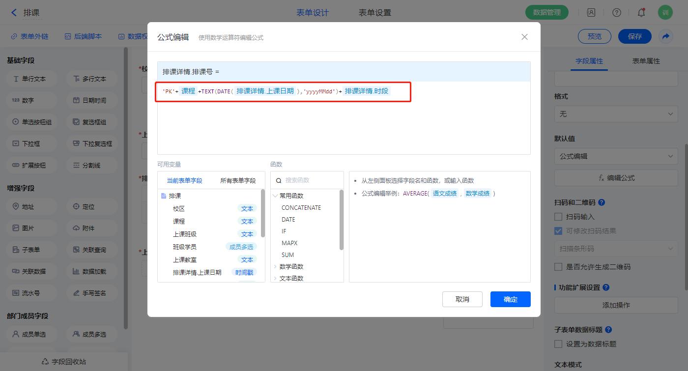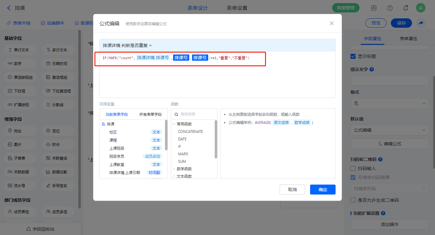 【排课详情.判断是否重复】字段,默认值选择公式编辑,如图设置公式,该字段为不可见字段;