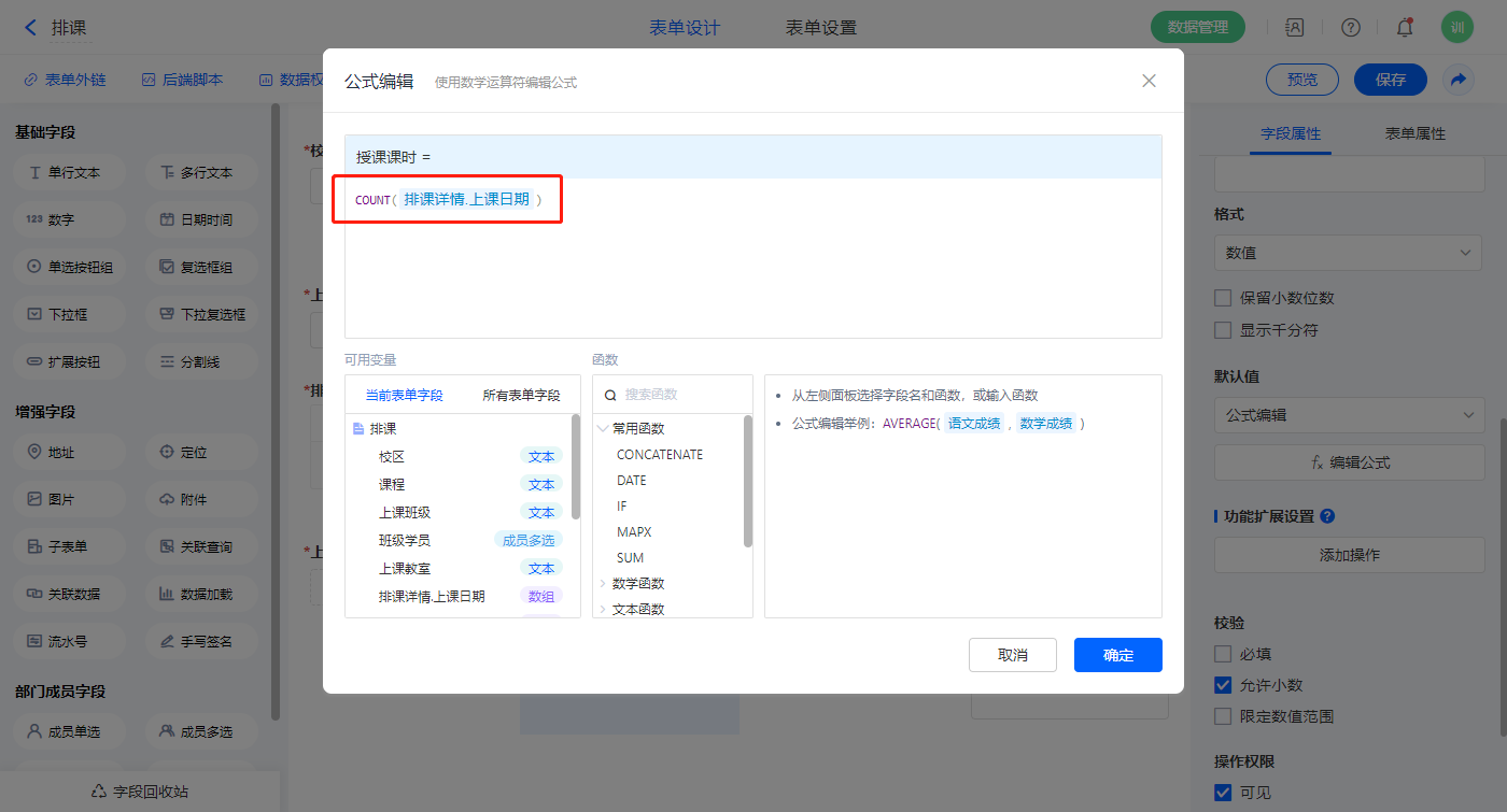 【授课课时】字段,默认值选择公式编辑,如图设置公式;