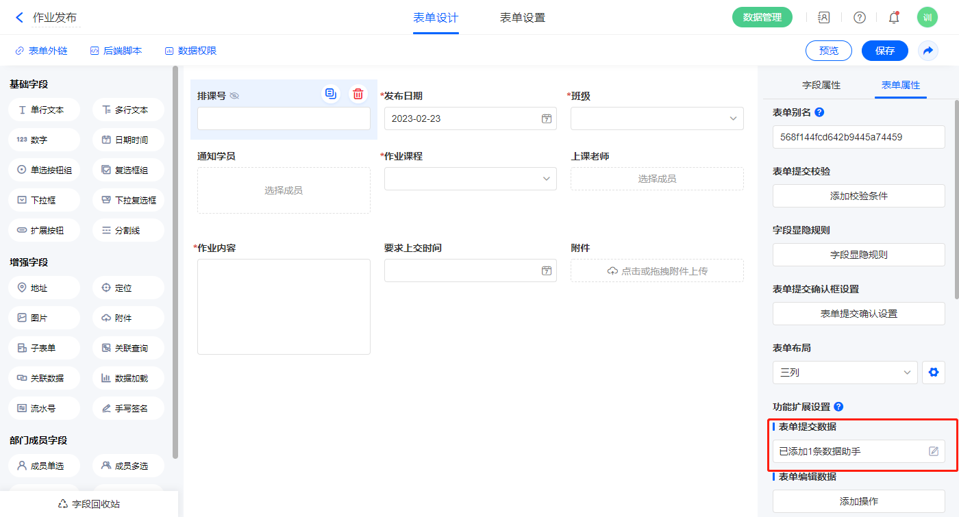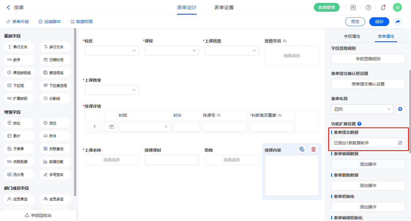 3)表单提交设置1条数据助手,名称为排课明细;