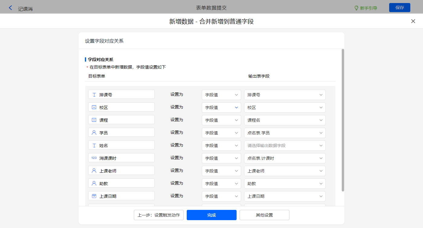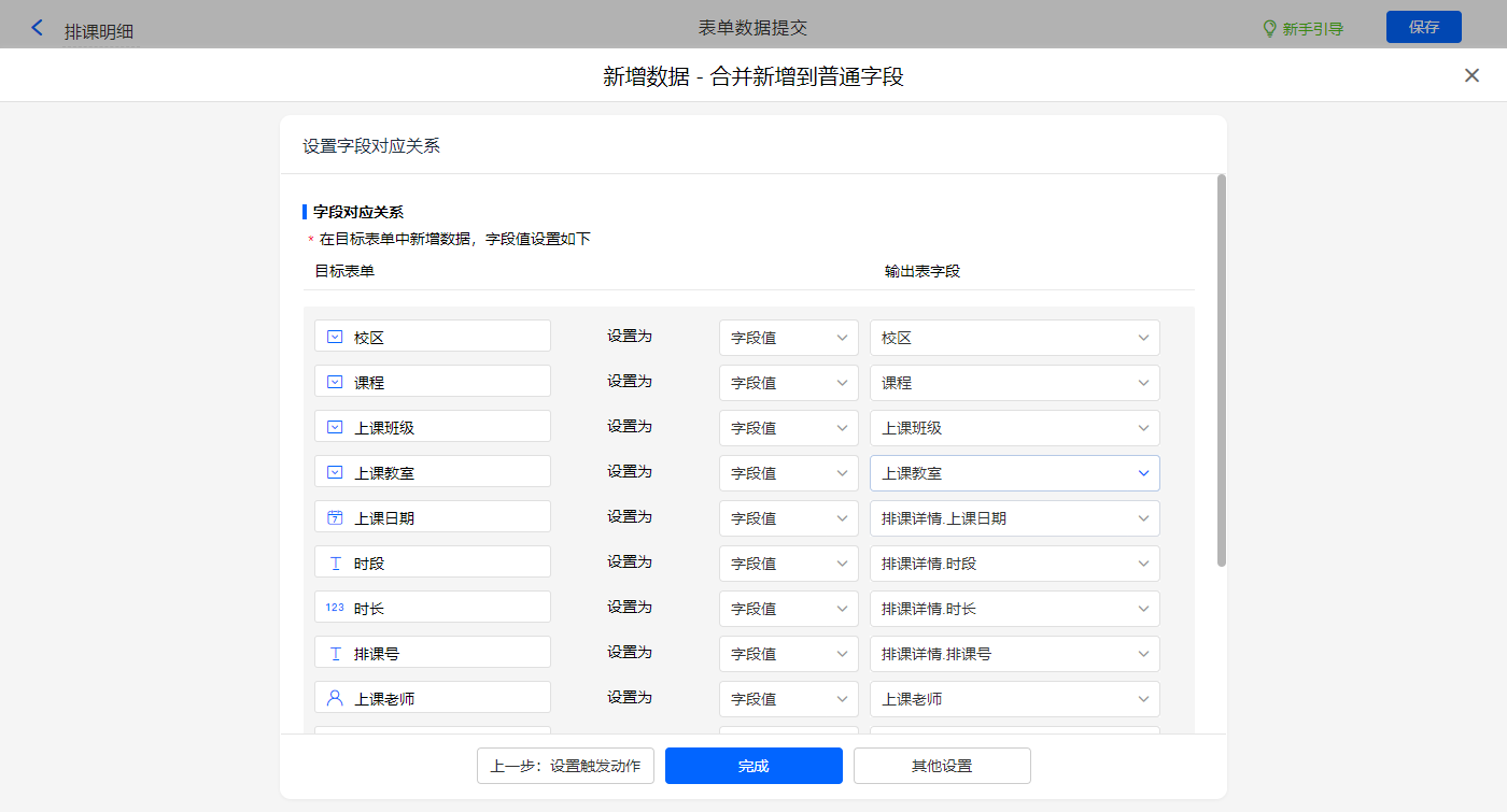 新增新增数据的执行动作,选择目标表单【排课明细】,对应赋值字段,设置好点击【完成】并保存该数据助手;