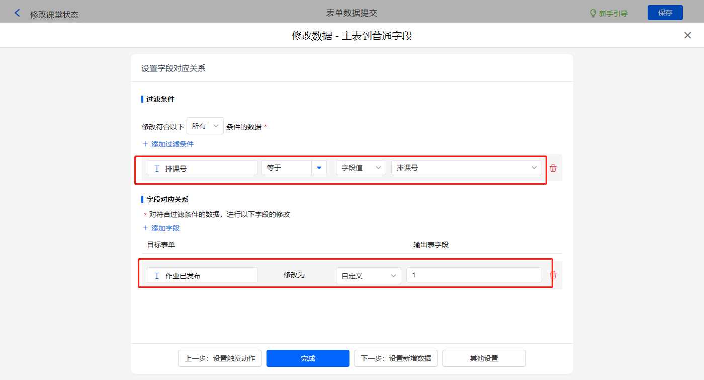 新增修改数据的执行动作,选择目标表单【排课明细】,配置过滤条件及对应赋值字段,设置好点击【完成】并保存该数据助手;