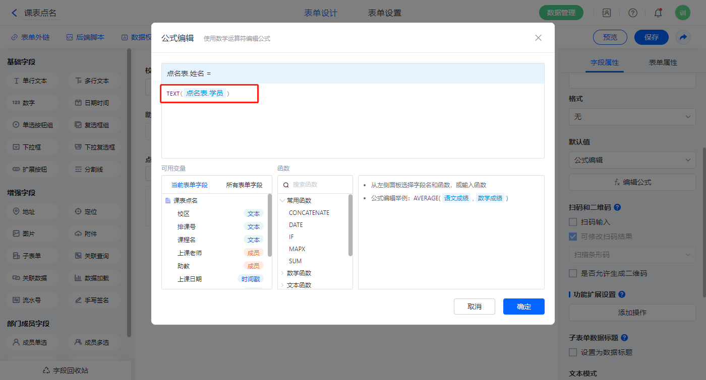 【点名表.姓名】字段,默认值选择公式编辑,如图设置公式,并设置操作权限为不可见;
