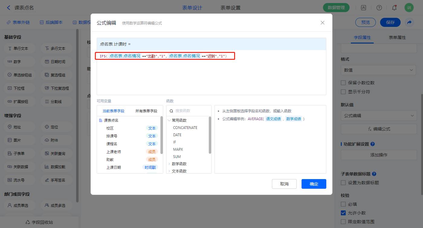 【点名表.计课时】字段,默认值选择公式编辑,如图设置公式,并设置操作权限为不可见;