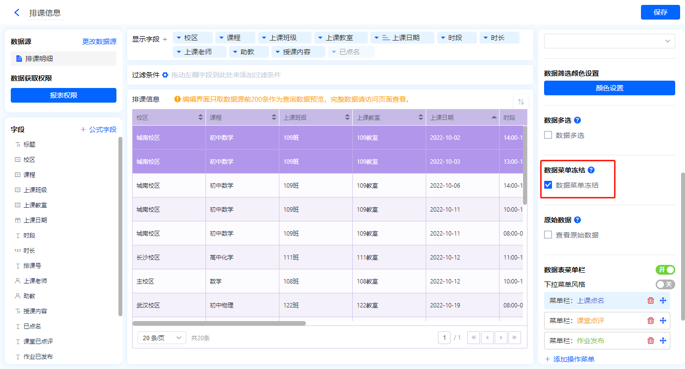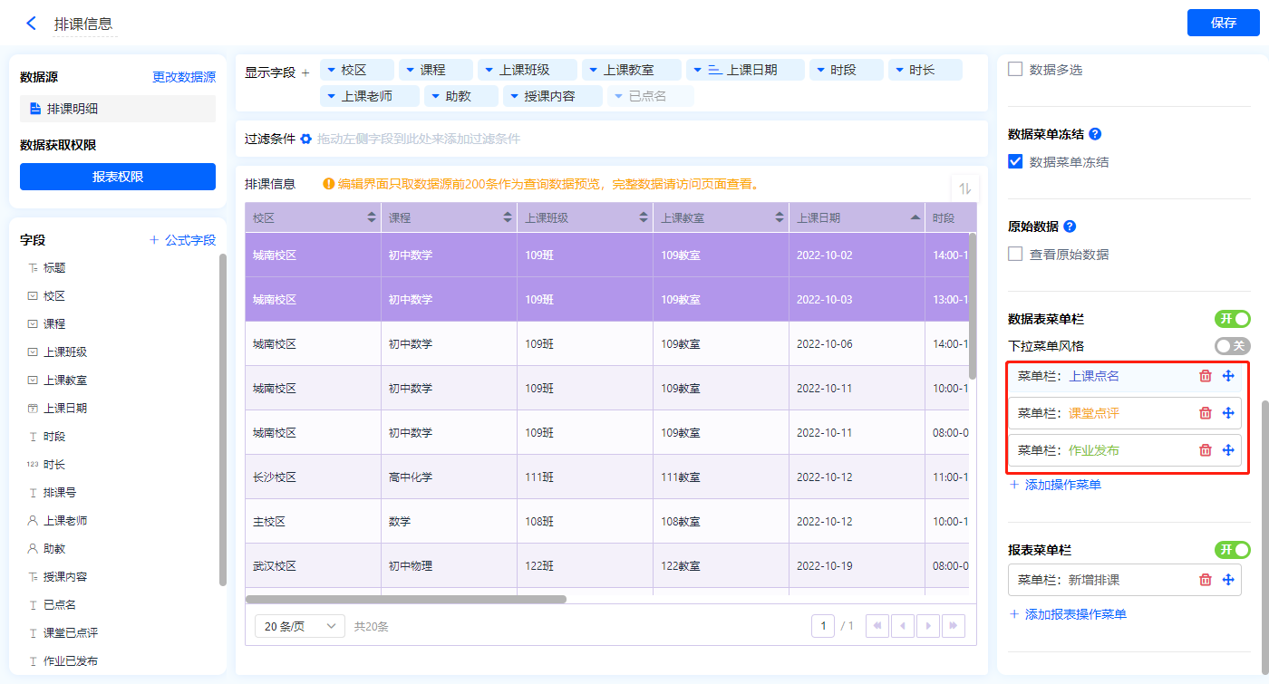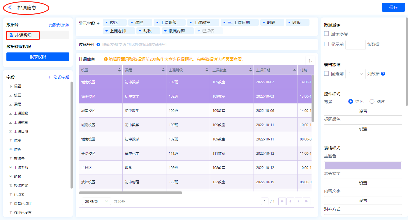 1)新增【课堂信息表】报表,用基础报表【数据表】展示数据源为表单【排课明细】的数据;