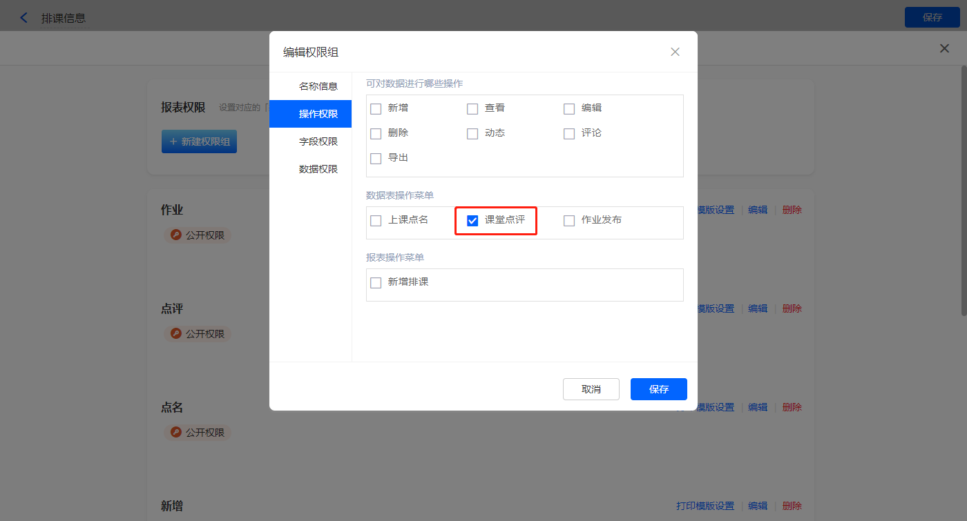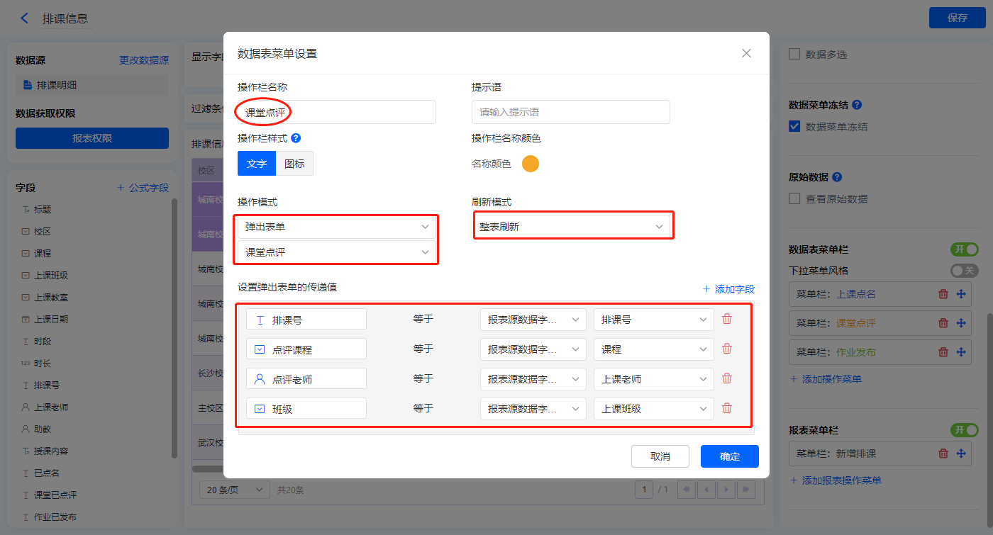 【课堂点评】的菜单栏,操作模式设置为弹出表单【课堂点评】;