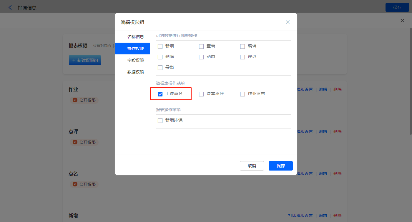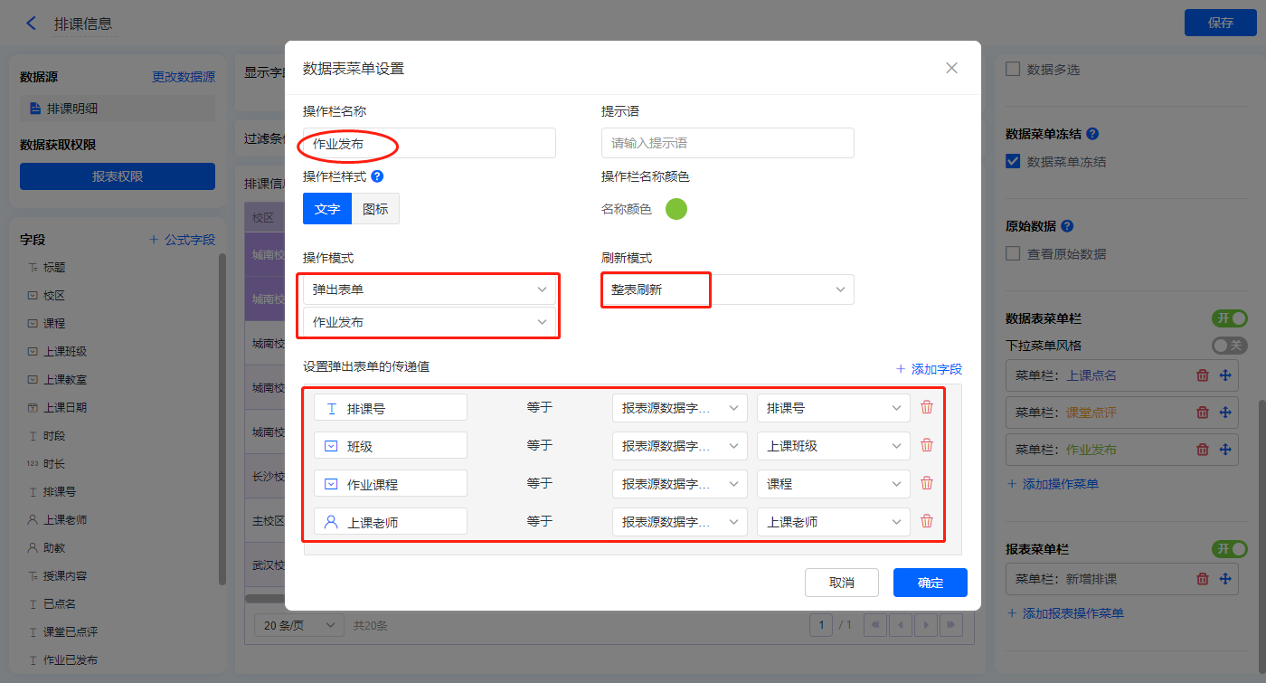 【上课点名】的菜单栏,操作模式设置为弹出表单【课表点名】;