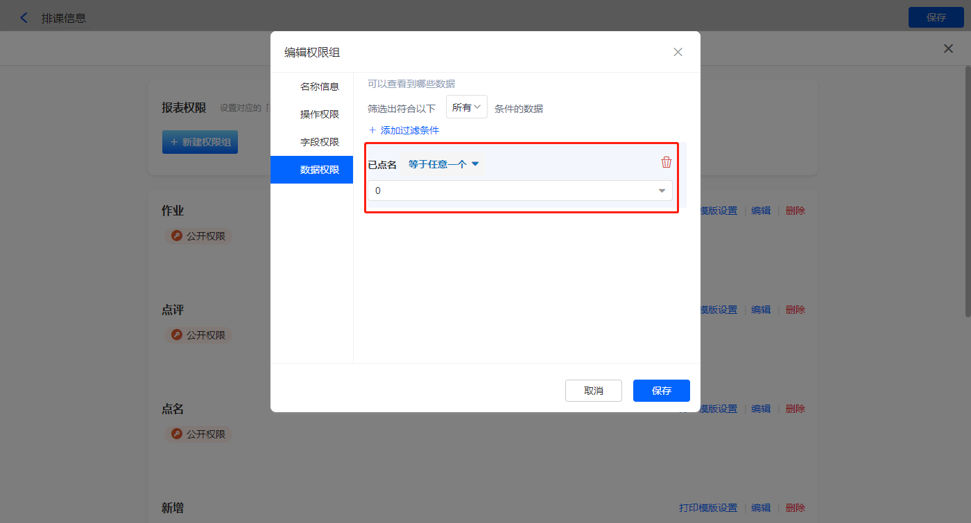 数据权限添加过滤条件,【已点名】等于0;