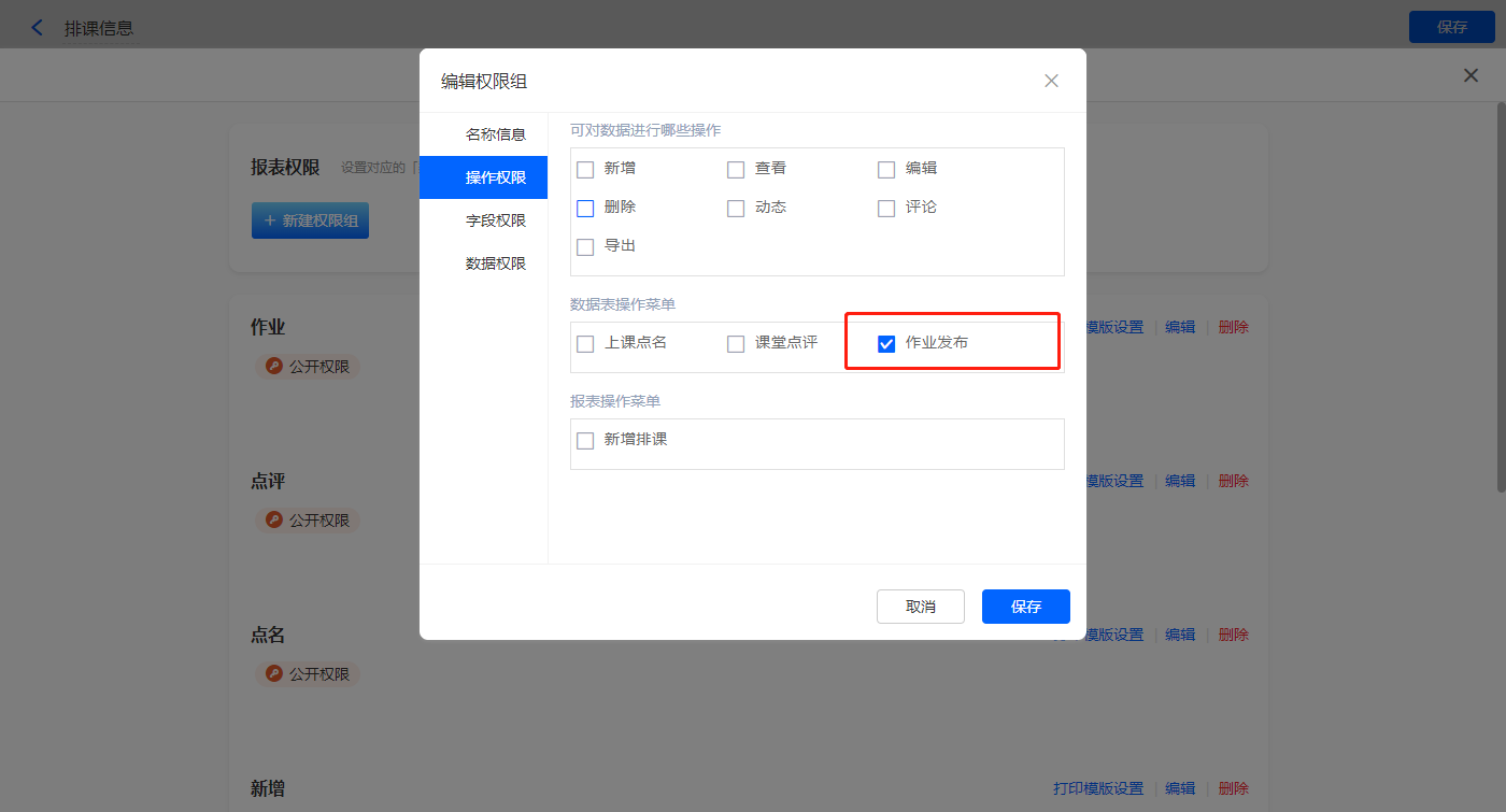 设置报表的权限,填入权限组名称作业,选择可操作的数据表菜单;