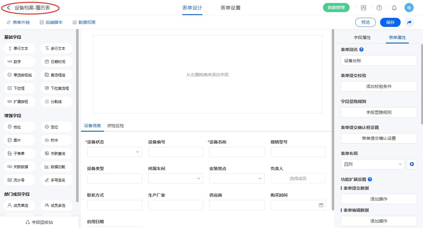 1)新建表单【设备档案-履历表】,字段设置如下: