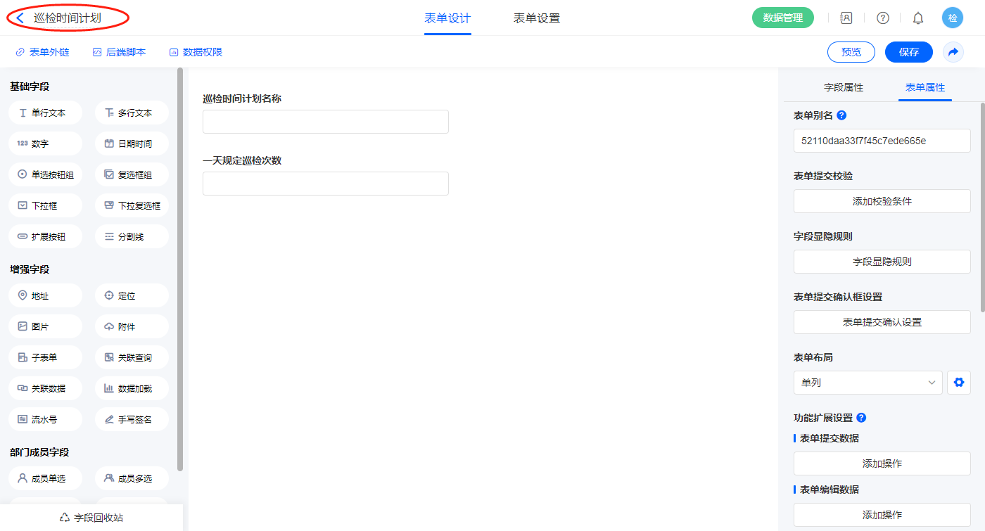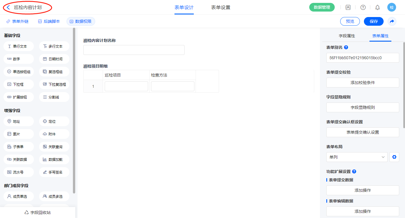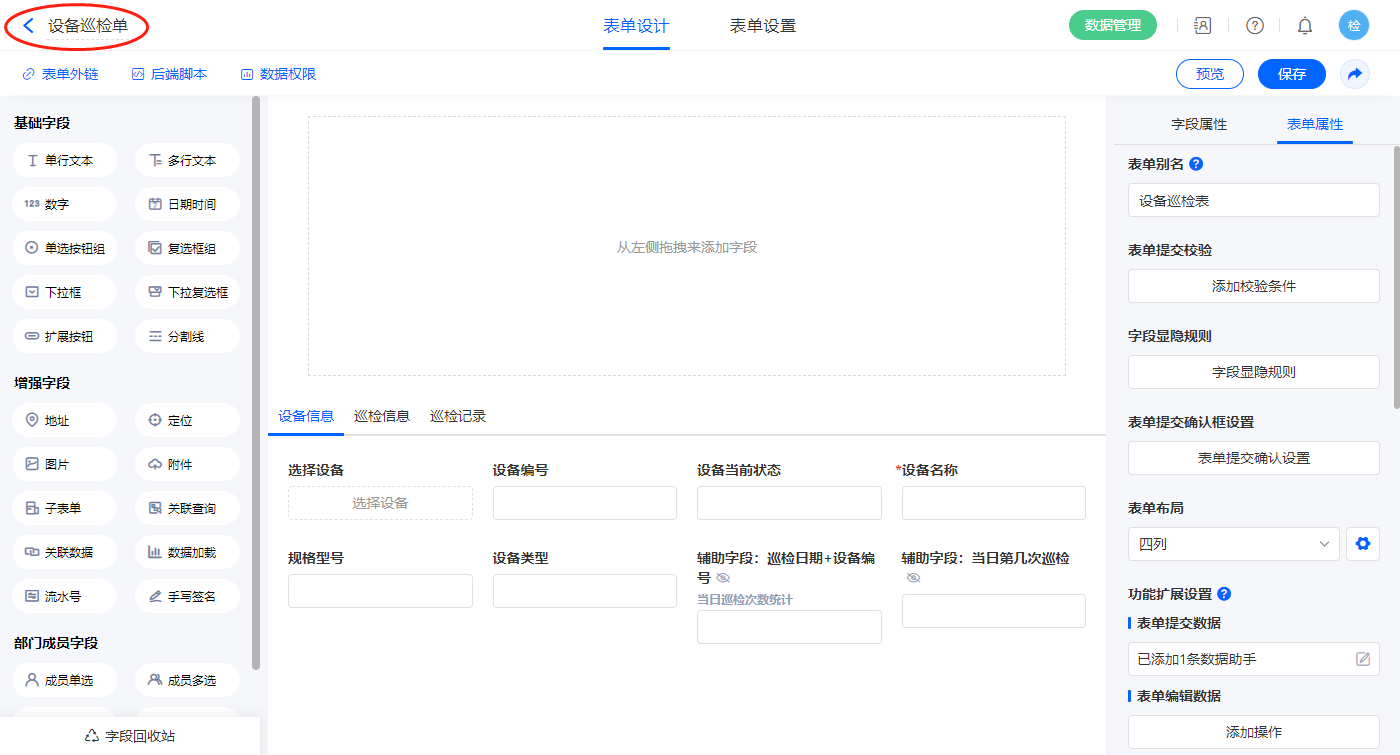 • 2.3、表单【设备巡检单】字段及表单属性设置