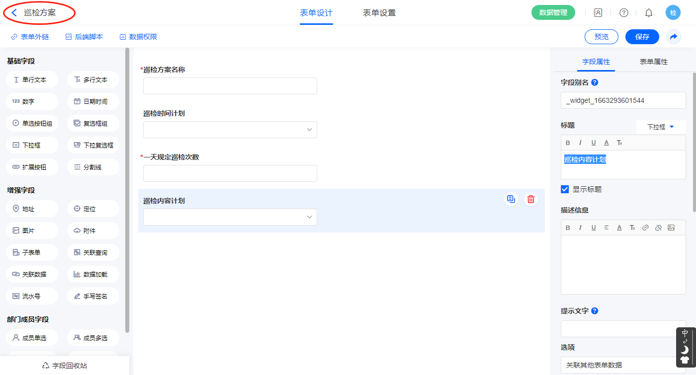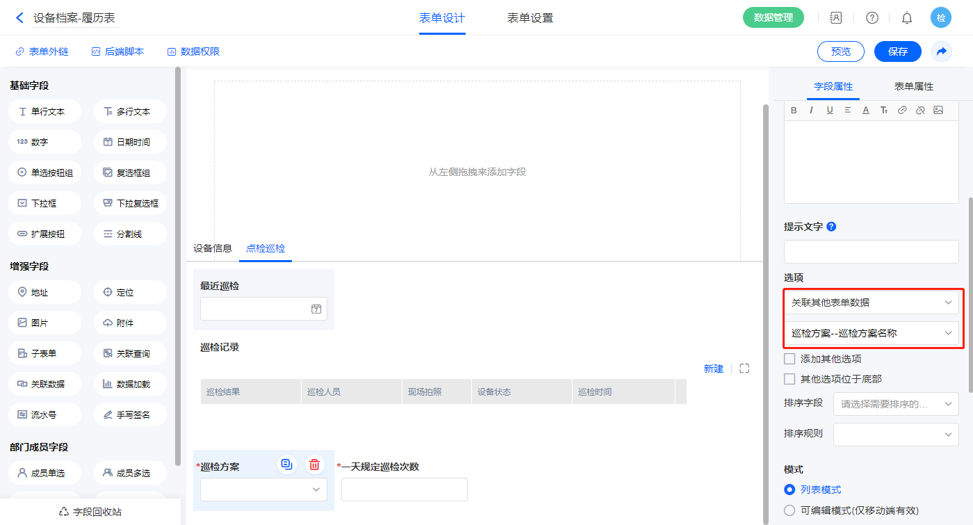 2)【巡检方案】字段,选择设置为关联其他表单数据,关联巡检方案的【巡检方案名称】字段;