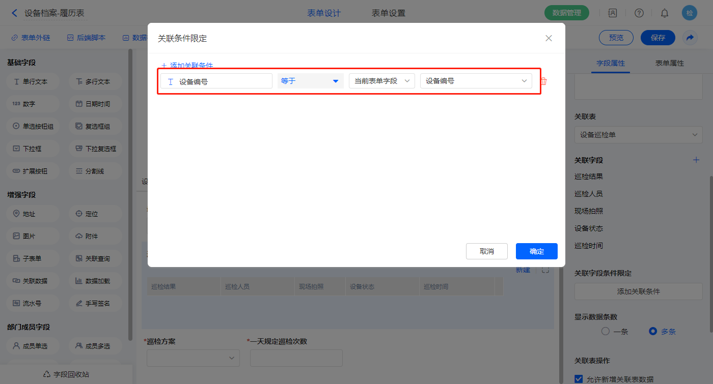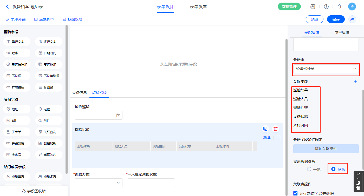 1)【巡检记录】关联查询字段,设置关联表为【设备巡检单】并如图选择关联字段,设置显示数据条数为多条;