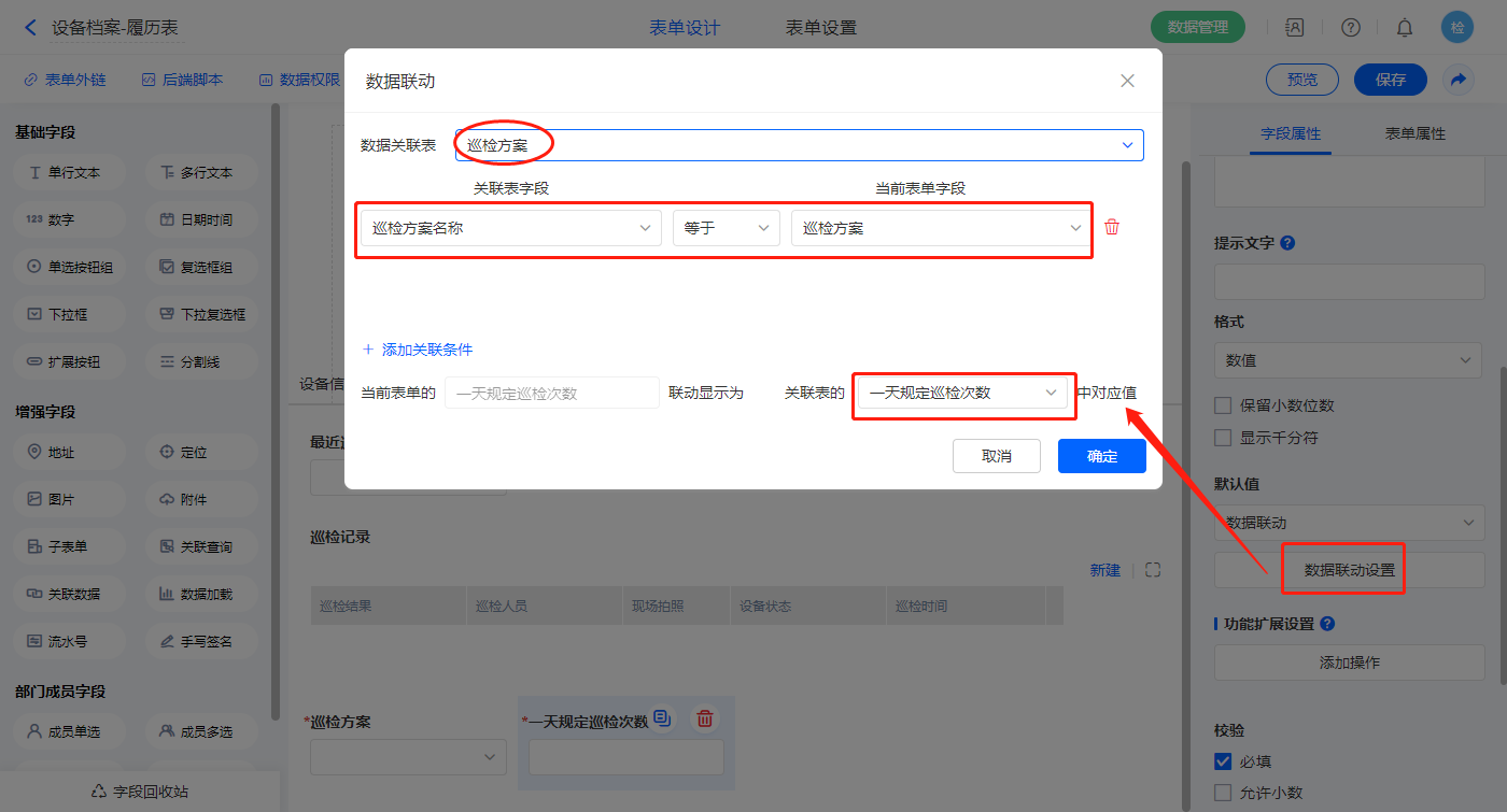 【一天规定巡检次数】字段,设置默认值为数据联动,设置联动条件及联动字段;