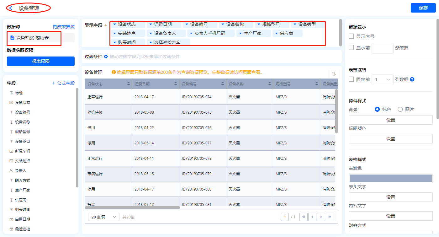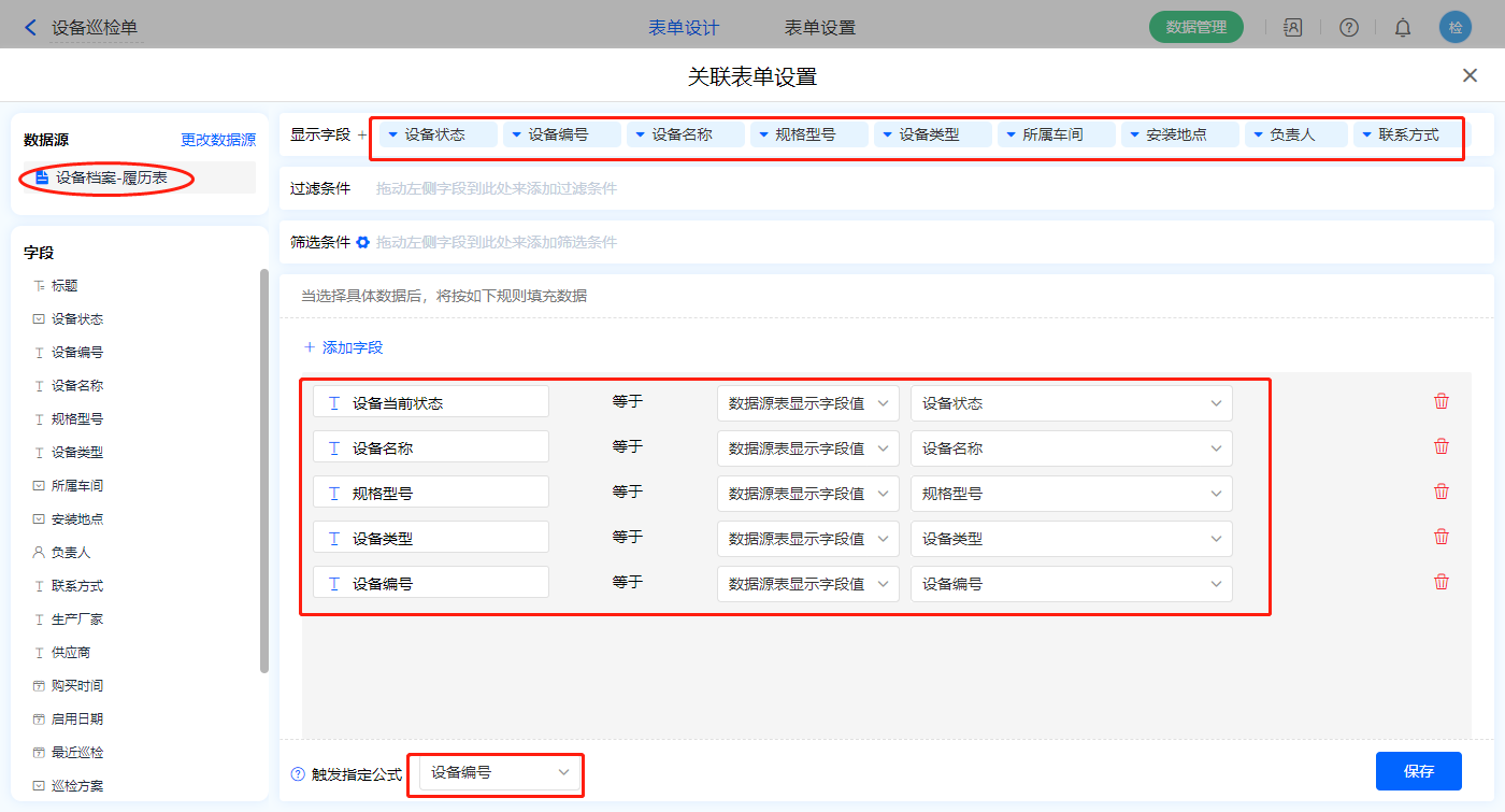 1)【选择设备】数据加载字段,数据源为【设备档案-履历表】,添加显示字段设置赋值字段,触发公式为【设备编号】字段,设置完成点击保存;
