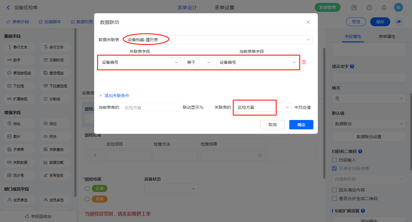 【巡检信息.设备名称】字段,设置默认值为数据联动,设置联动条件及联动字段;