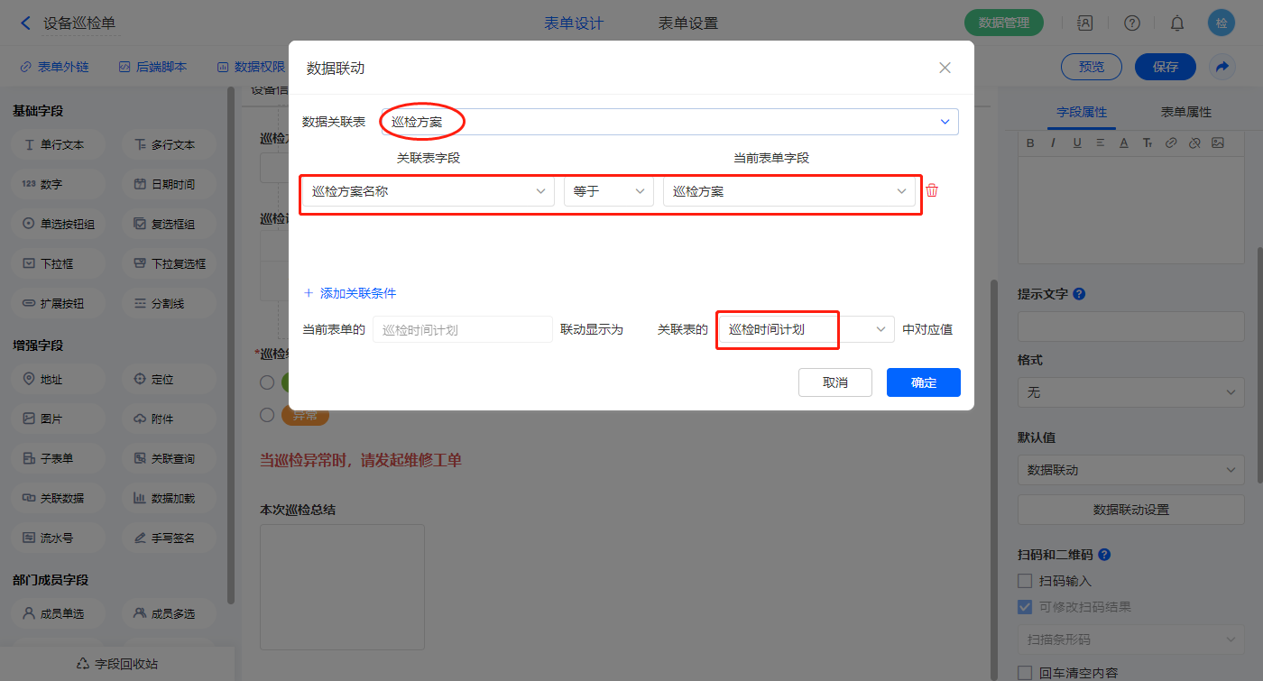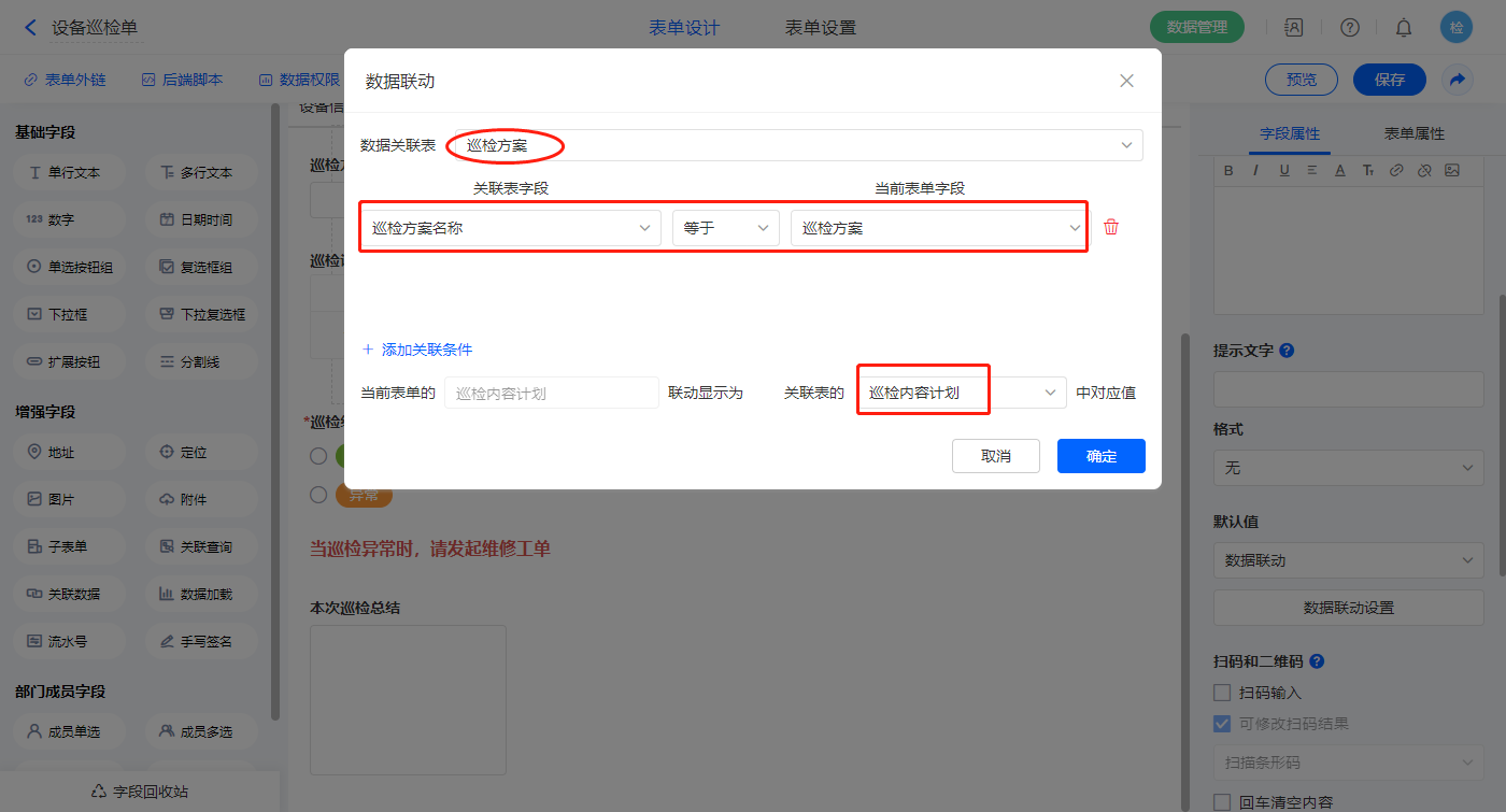 2)【巡检方案】字段,设置默认值为数据联动,联动的表单及条件一致,设置对应联动字段即可;