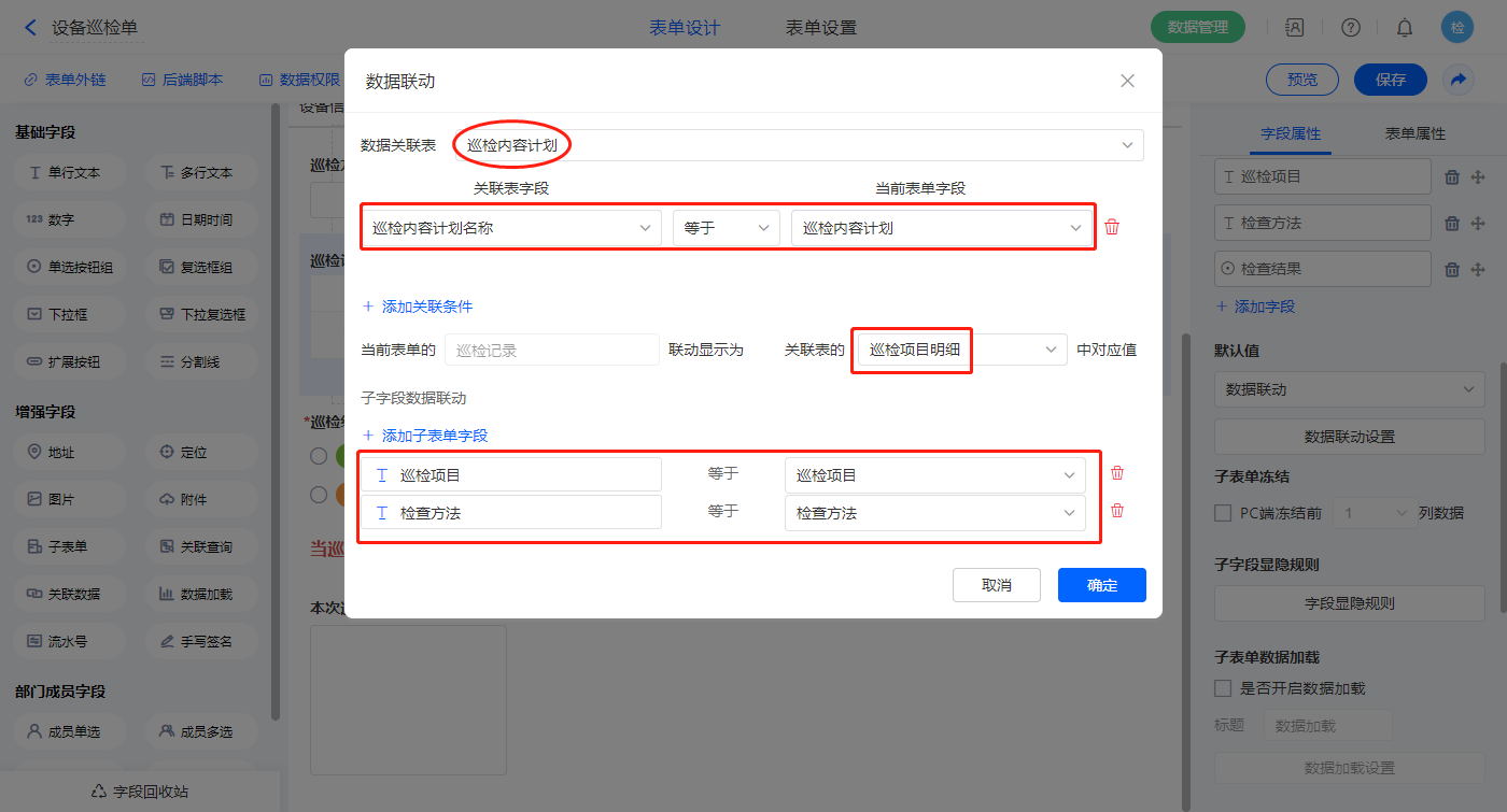 【巡检记录】子表单字段,设置默认值为数据联动,设置联动条件及联动字段;