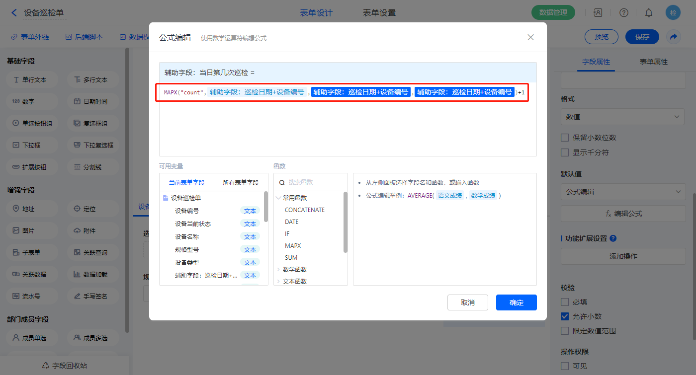 【辅助字段:当日第几次巡检】字段,默认值选择公式编辑,如图设置公式;