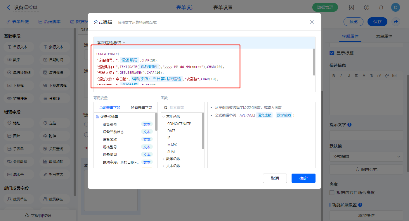 3)【辅助字段:巡检日期+设备编号】字段,默认值选择公式编辑,如图设置公式;