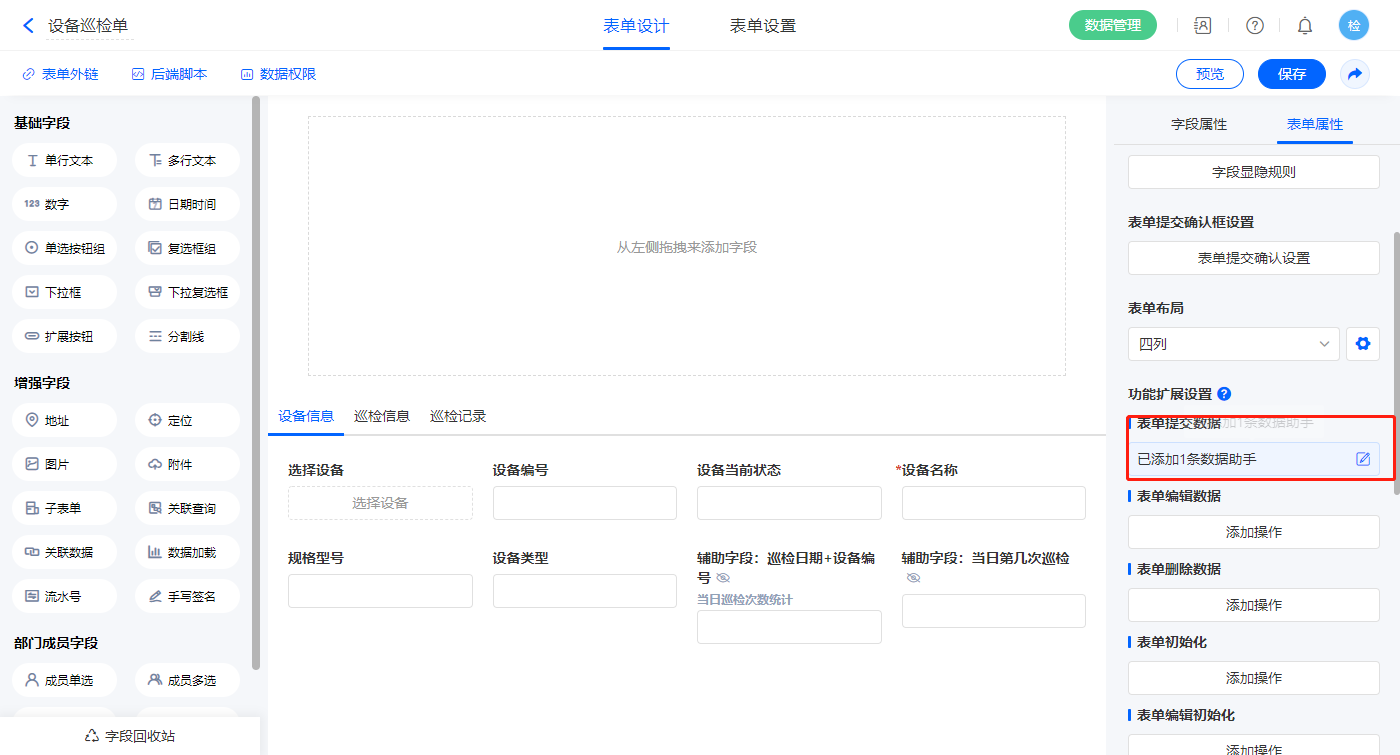 4)表单提交设置1条数据助手,名称为设备巡检处理;