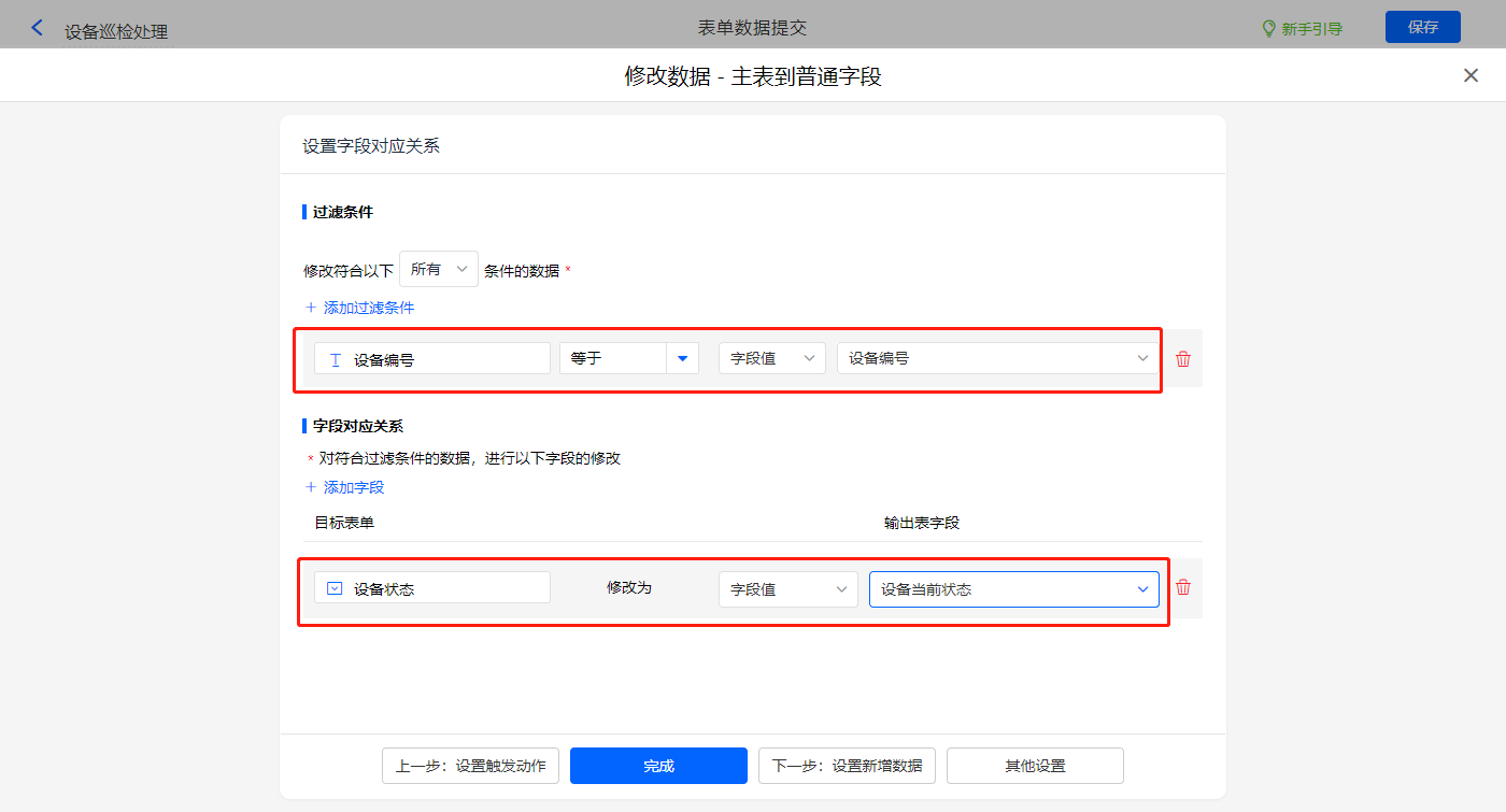 新增修改数据的执行动作,选择目标表单【设备档案-履历表】,配置过滤条件及对应赋值字段,设置好点击【完成】并保存该数据助手;